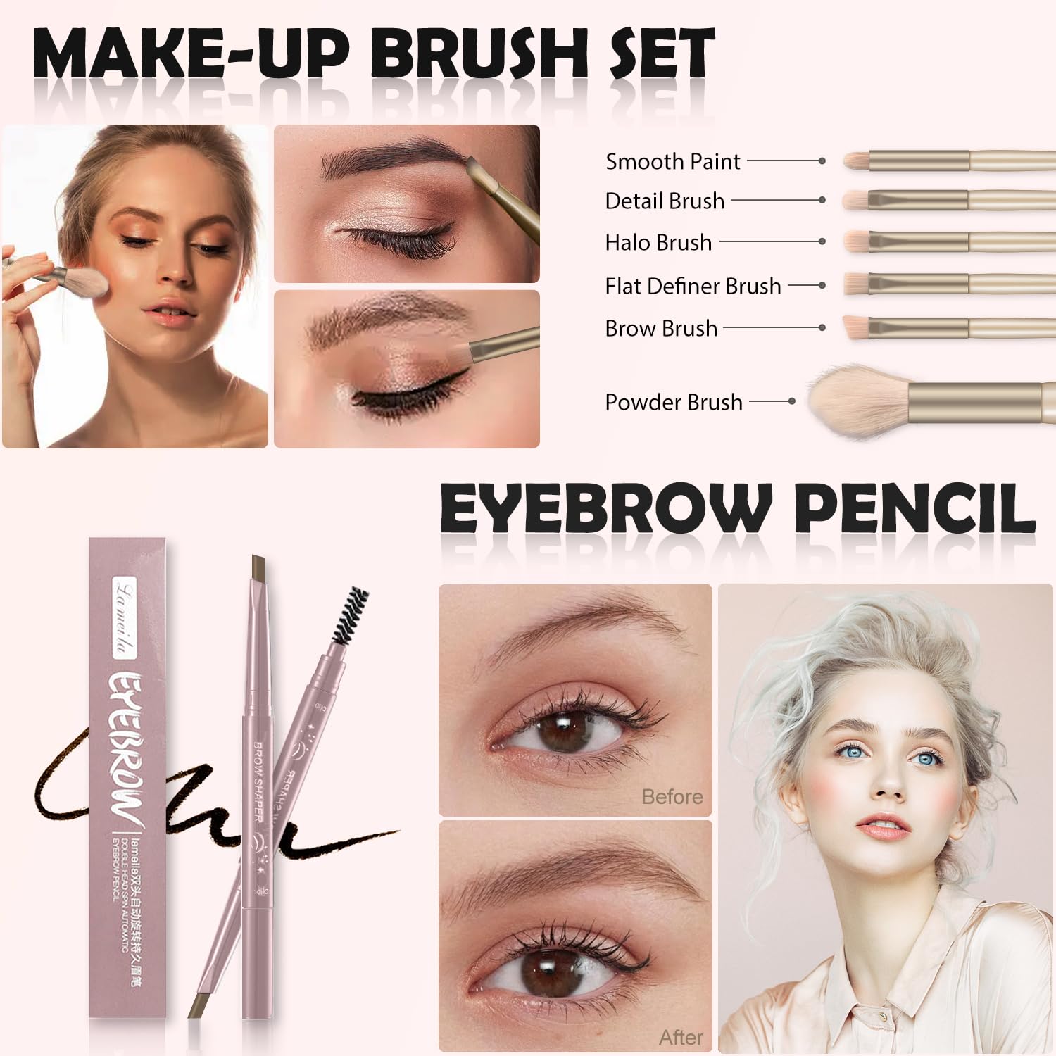 - đăWhat's in the Makeup Set?ă1 x 10 colors eyeshadow palette, 1 x waterproof and smudge-shield mascara, 1 x waterproof and smooth liquid eyeliner, 1 x Sepia eyebrow pencil, 1 x 6 pcs soft makeup brush set, 1 x lip gloss. Our eyeshadow palette's expertly curated shades are perfect for shading, highlighting, and defining eyes, brows, and the contours of the face.