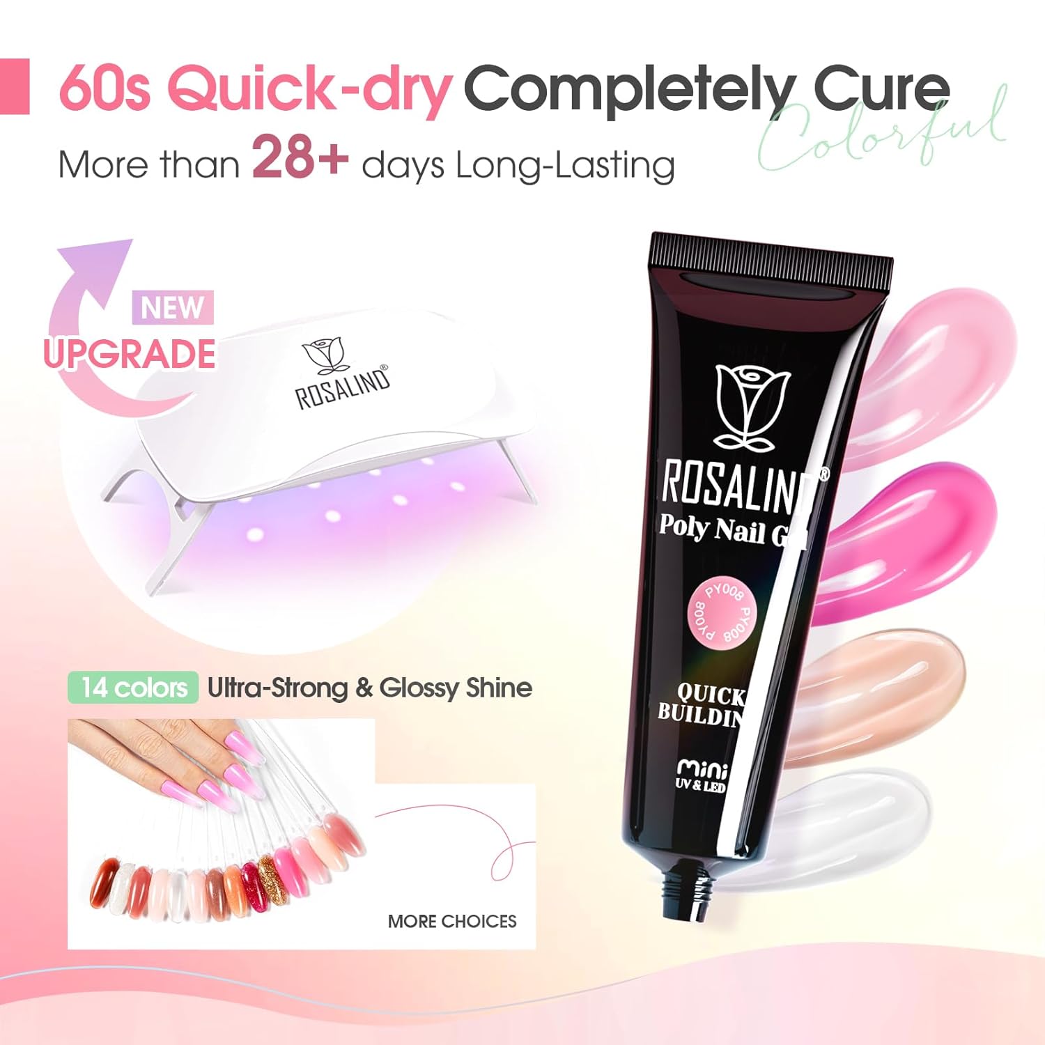- Versatile Use: With 14 beautiful and trendy colors, it is suitable for nail art beginners and perfect for gift giving. ROSALIND poly nail extension gel kit is perfect for creating rhinestone nails, dry flower nails and glitter nails, as well as press-on nails on manicure. This poly extension gel is suitable for different shapes of nails such as square, oval, coffin and French nails.
