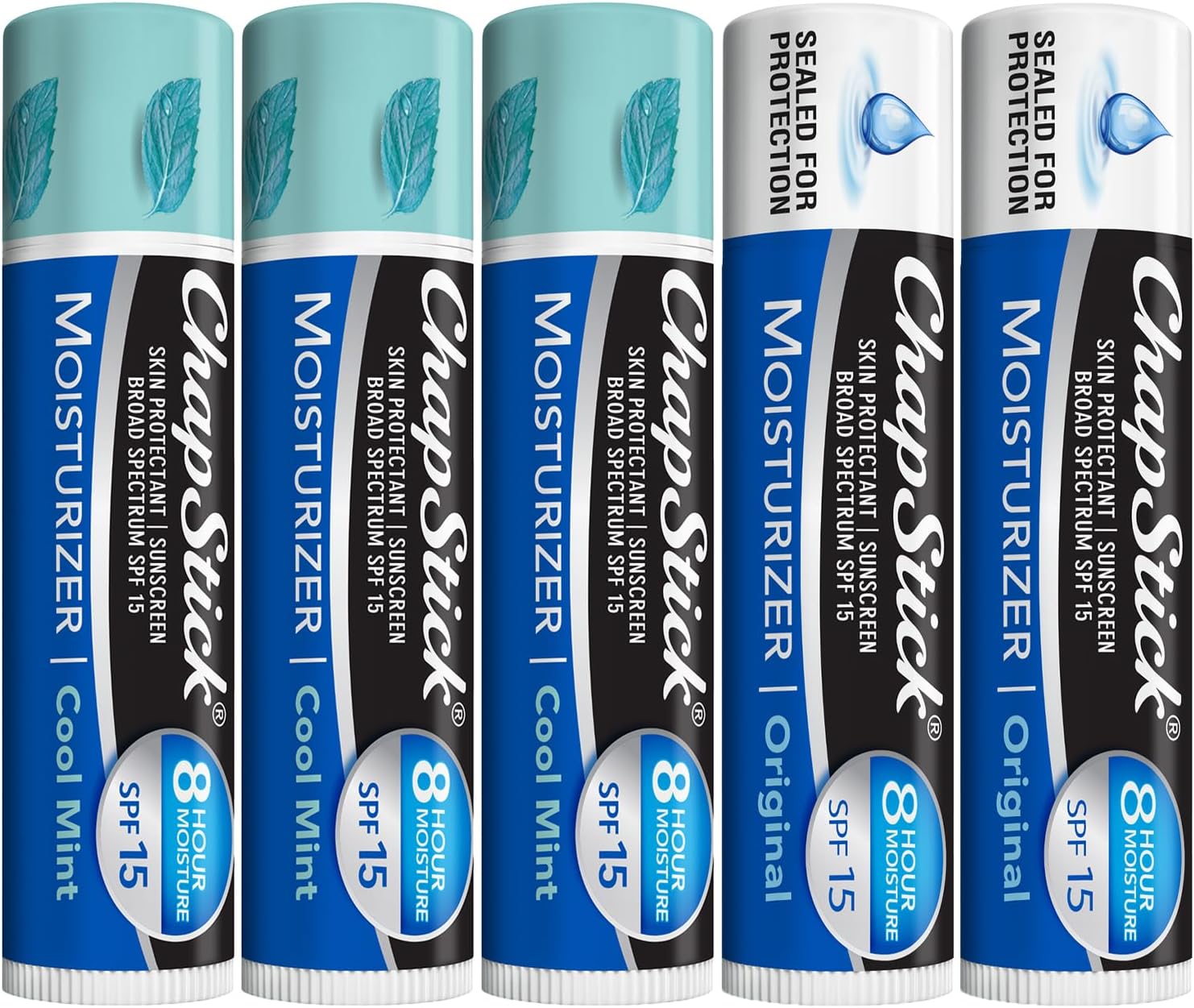 ChapStick Lip Balm Moisturizer 2-in-1 Lipcare SPF 15 Bundle – Cool Mint 3-Pack + Original 2-Pack, 0.15 Oz Ea (5 Piece Set)