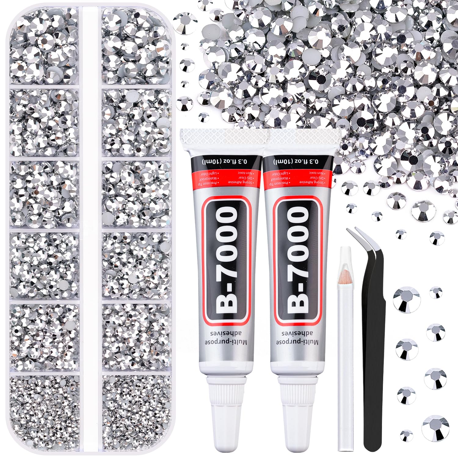 6100Pcs Resin Rhinestones for Crafting with 2Pcs 10ml B7000 Jewelry Glue, 1 Box Flatback Crystals Diamond (Silver) for Bedazzling Crafts DIY Nail Art Non Hotfix Gems for Clothing Shoes