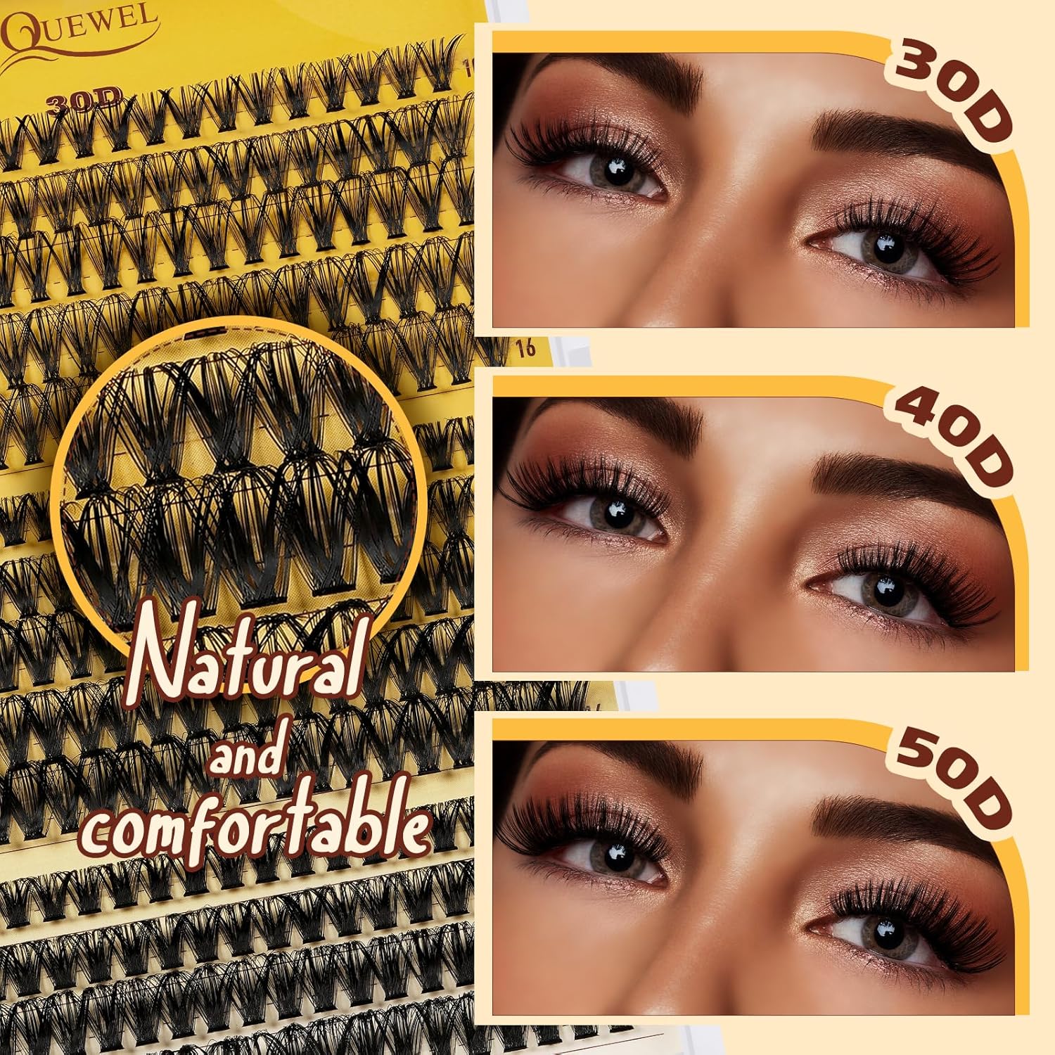 - 30D+40D+50D Lash Clusters Kit: QUEWEL 30D+40D+50D lash clusters include 3 styles, mix length 10-16mm D lash clusters. In this DIY lash extension kit, you can by matching lashes clusters of different lengths and style test which lash clusters are suitable for you. The lash clusters natural matte effect makes wearing more natural. You can also create natural eyes, cat eyes, or doll eyes. Making your eyes look fuller and more attractive