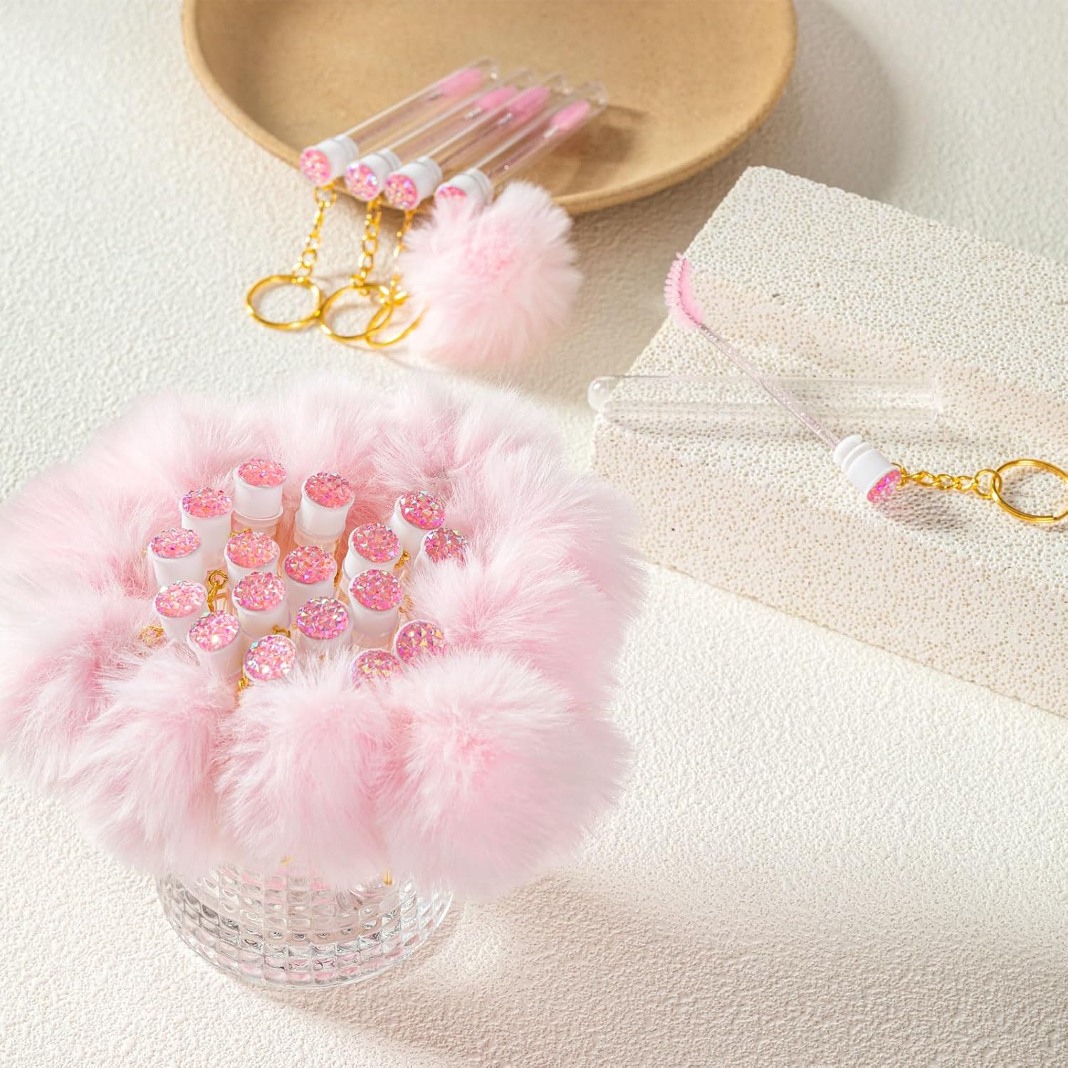 Upgrade 48 Pieces Disposable Mascara Wands Set,Include 24 Pcs Crystal Lash Spoolies Brush and 24 Pcs Reusable Keychain Empty Eyelash Brush Tubes