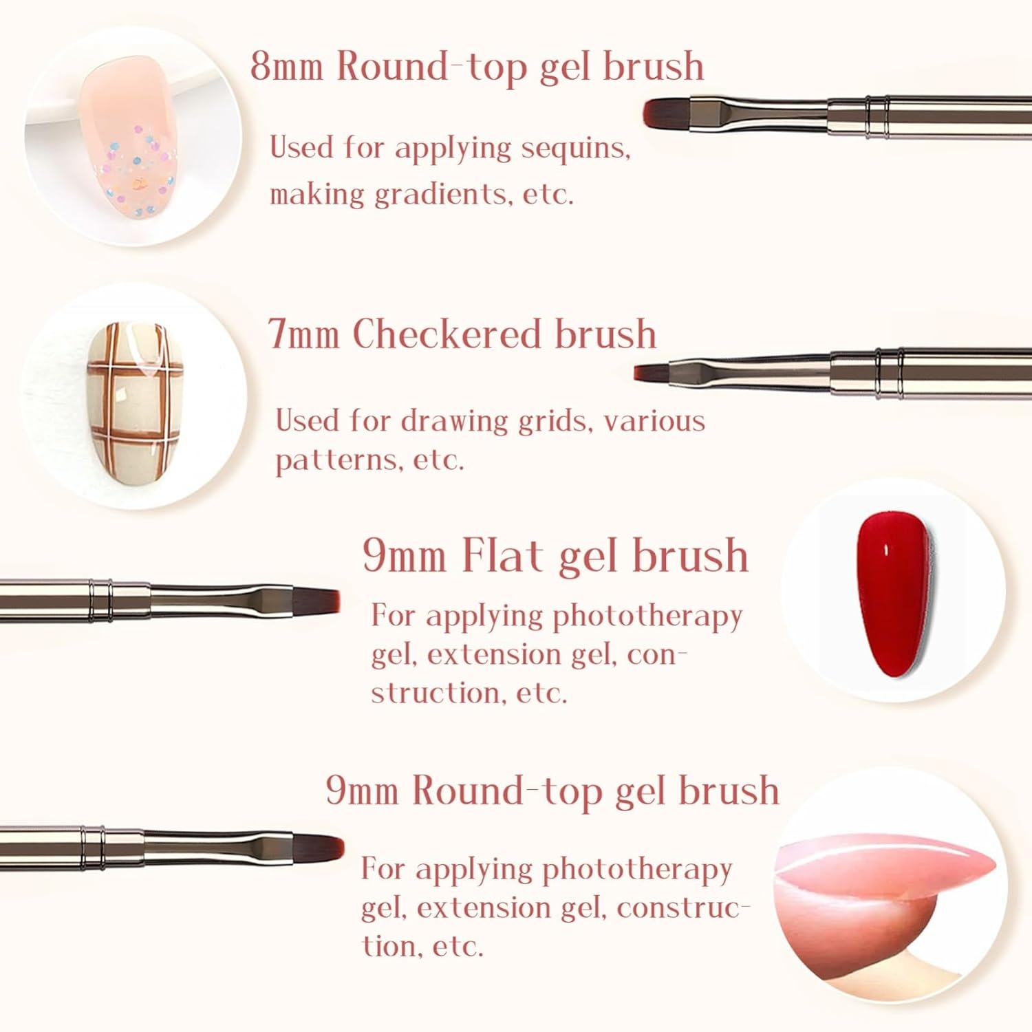 - Ergonomic and Comfortable Handles: The brushes feature lightweight and ergonomic handles that provide a comfortable grip, reducing hand fatigue during extended use. Whether you're a professional nail artist or a beginner, these brushes offer a seamless and enjoyable application experience.