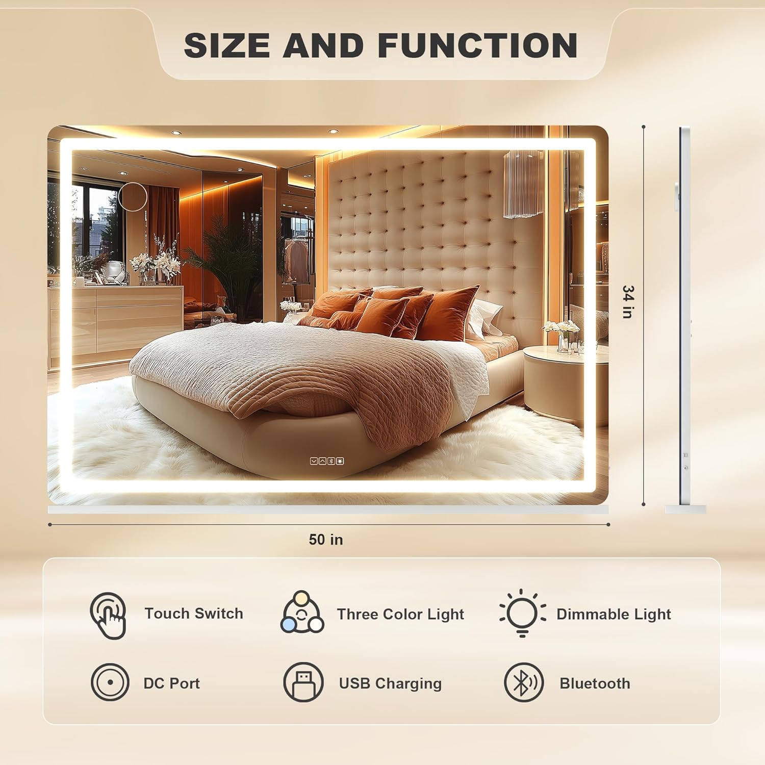 - đăBrightness Adjustable and 3 Color Lighting ModesăHASIPU lighted makeup mirror surrounded by 50,000 hours life Max 6000 Lumens high brightness LED Light Strip, with warm /natural /cold white three-tone settings, adjustable brightness 0%-100% can meet your makeup requirement.