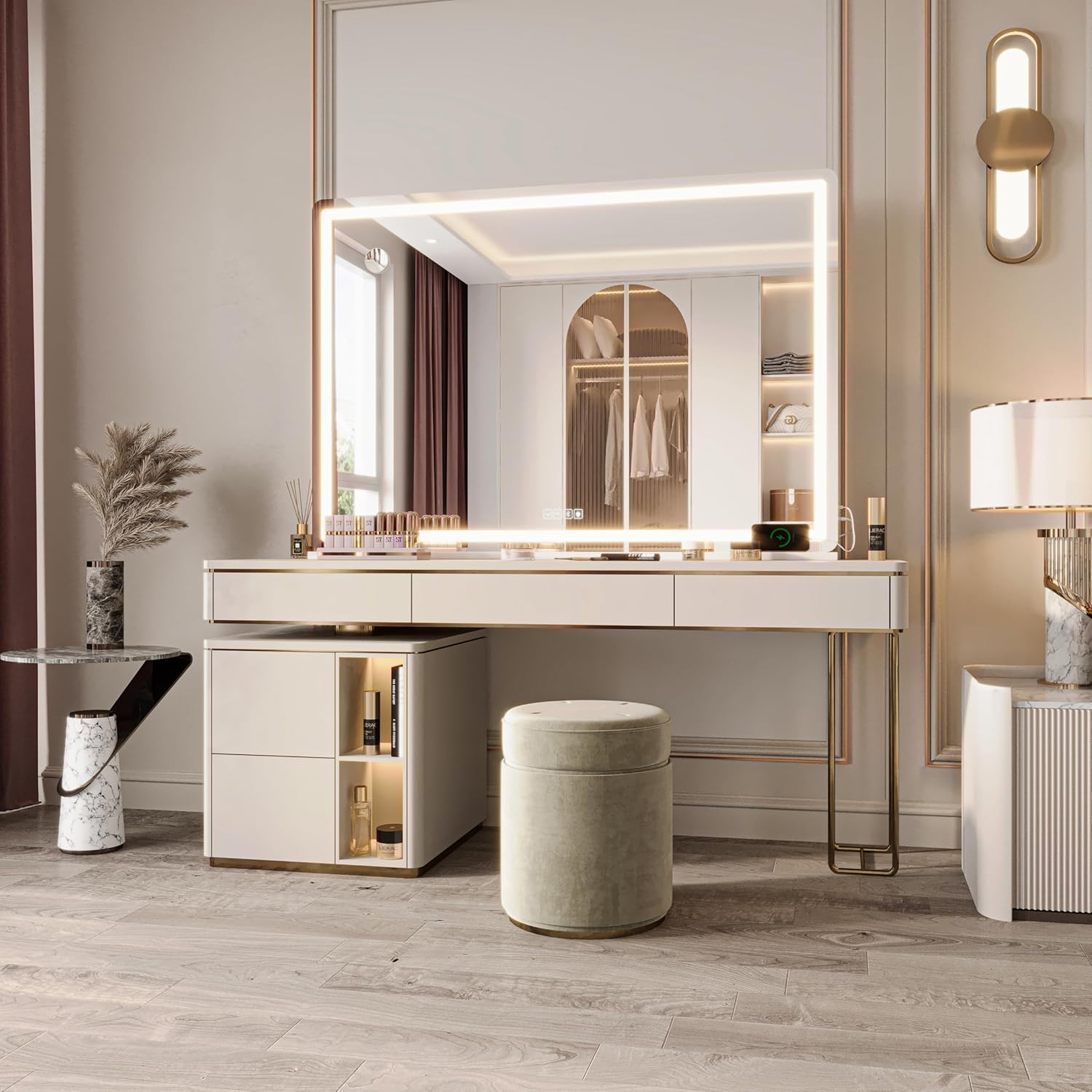 Hasipu Vanity Mirror with Lights and Bluetooth Speaker, 55.1" x 35.8" LED Makeup Mirror, Lighted Makeup Mirror with Dimmable 3 Modes, Touch Screen Control Vanity Mirror Round White