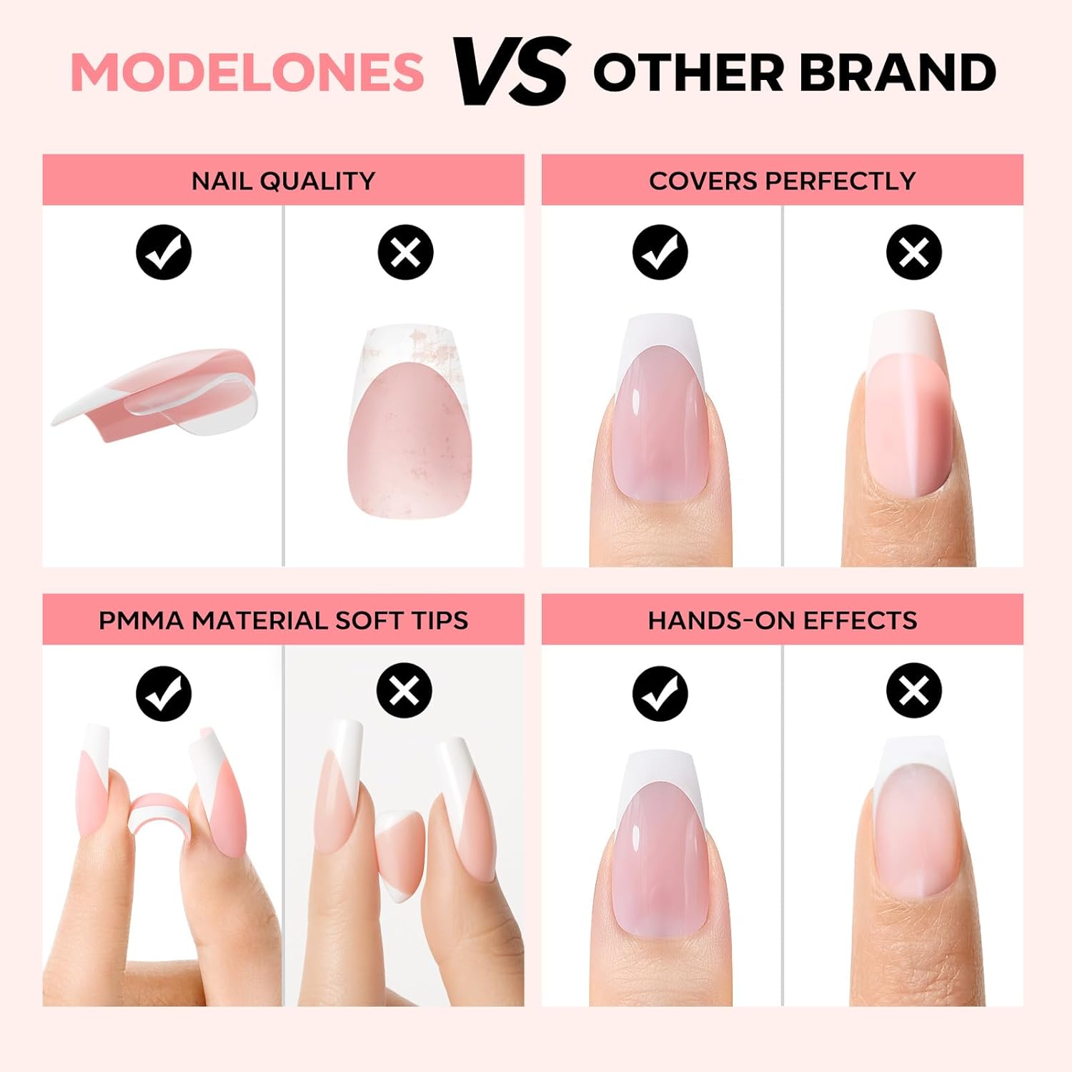 - PMMA Soft Material: These premium French nails tip feature flexible yet durable PMMA soft gel material with a pre-designed curvature that seamlessly blends with your natural nail shape for a flawless, salon-quality finish.