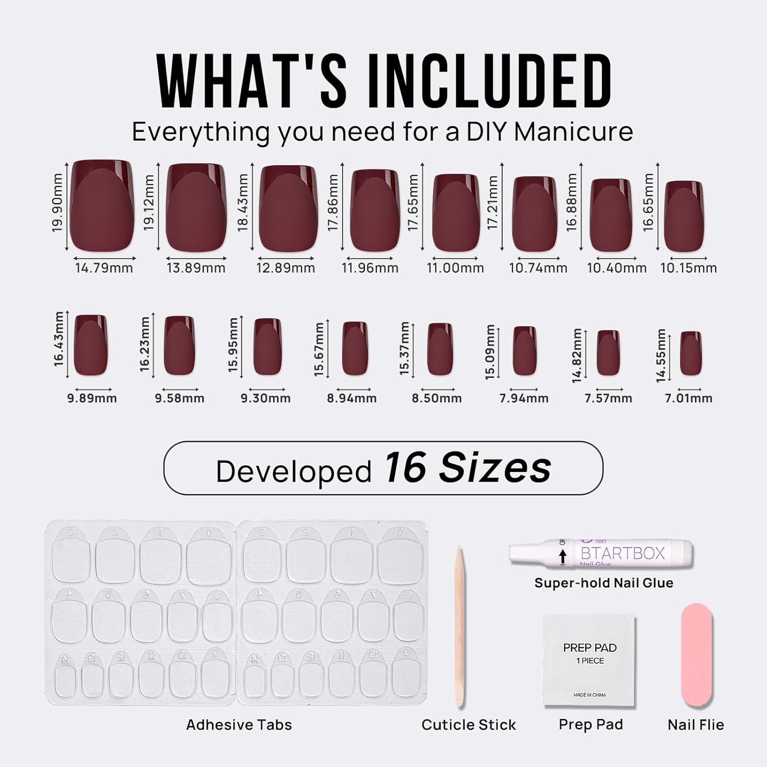 BTArtbox Press on Nails Short Square - Dark Red Nails with Glossy French Tips in a Matte Finish, Soft Gel Fake Nails Glue On Nails in 16 Sizes for for Valentine's Day Gift, Cozy Cocoa