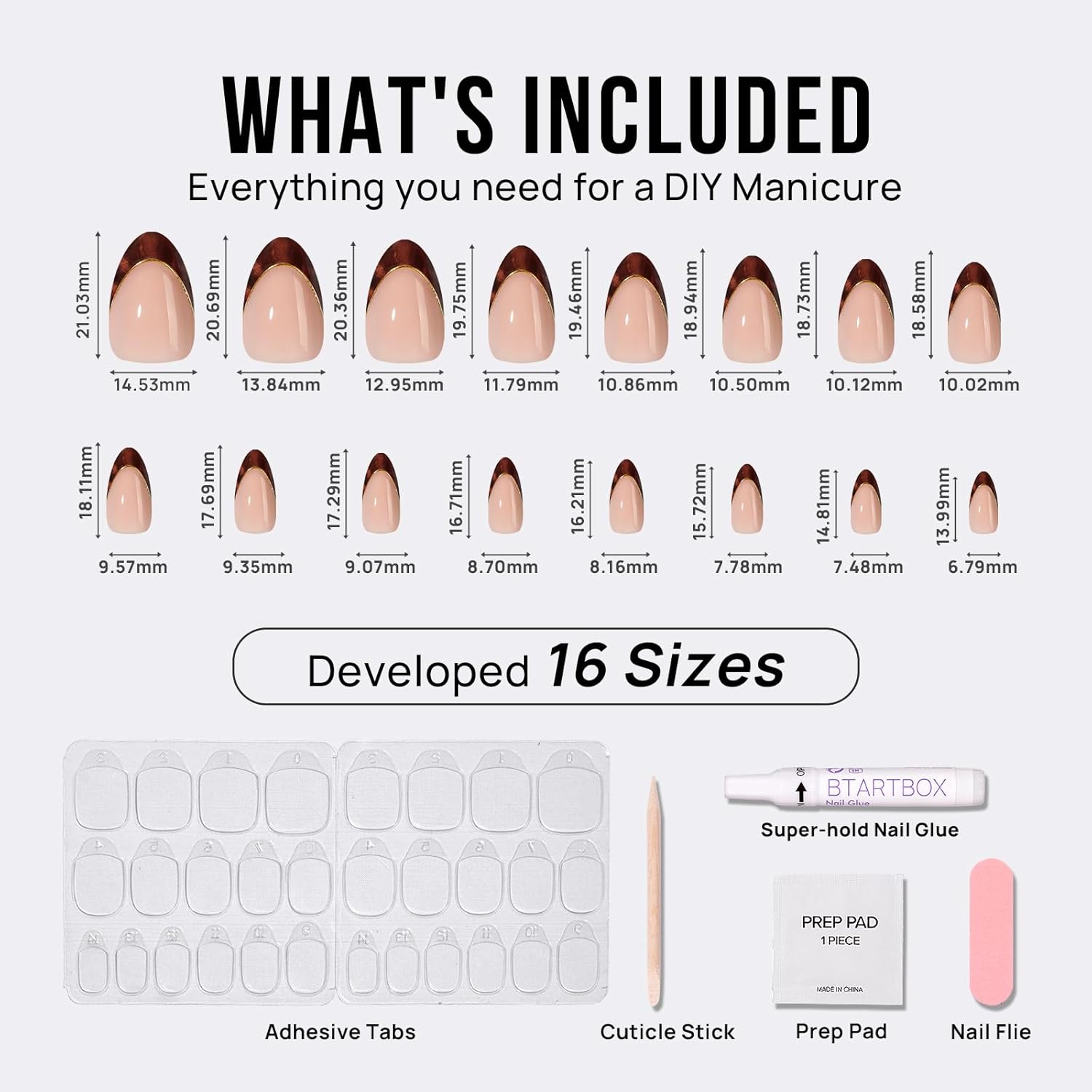 - What's Included: 16 nail sizes ensure a totally custom fit, plus we give you everything needed just in case! Each set comes complete with a storage box, nail glue, adhesive tabs, double-sided nail file, cuticle stick, and prep pad