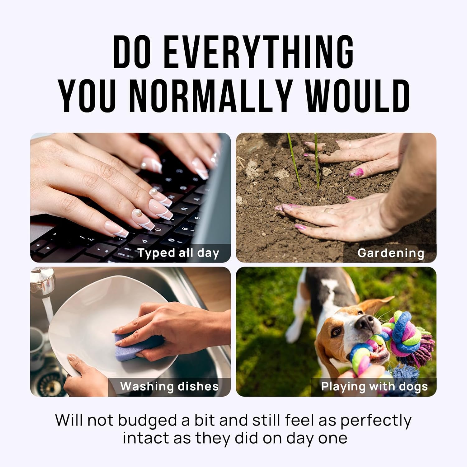 - Do Everything You Normally Would: All BTArtbox fake nails short offer feature protective building gel finish so that you are able to do everything you normally would, such as typing, gardening, houseworking or playing with your pet. They will not budged a bit and still feel as perfectly intact as they did on day one
