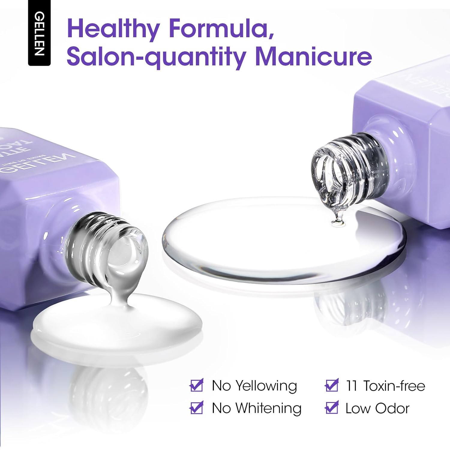 - Natural & Healthy No Wipe Nail Top Coat: Gellen gel nail top coat is crafted from a gentle and natural resin formula, free of harmful ingredients, non-toxic, non-yellowing, low in odor, and skin-friendly. It effectively addresses common issues with other UV top coats such as nicks, chips, and smudges while promoting healthy nails. Feel confident in choosing Gellen top coat for your nail art manicure & nail salon!