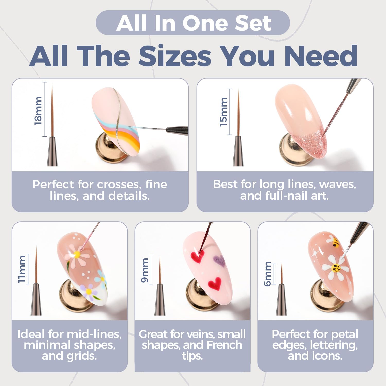 - 💖Available in 5 Sizes: This nail brush set comes in 6mm, 9mm, 11mm, 15mm, and 18mm lengths—providing versatile options to suit different nail art techniques, from fine detailing to longer strokes, making it ideal for both beginners and professionals