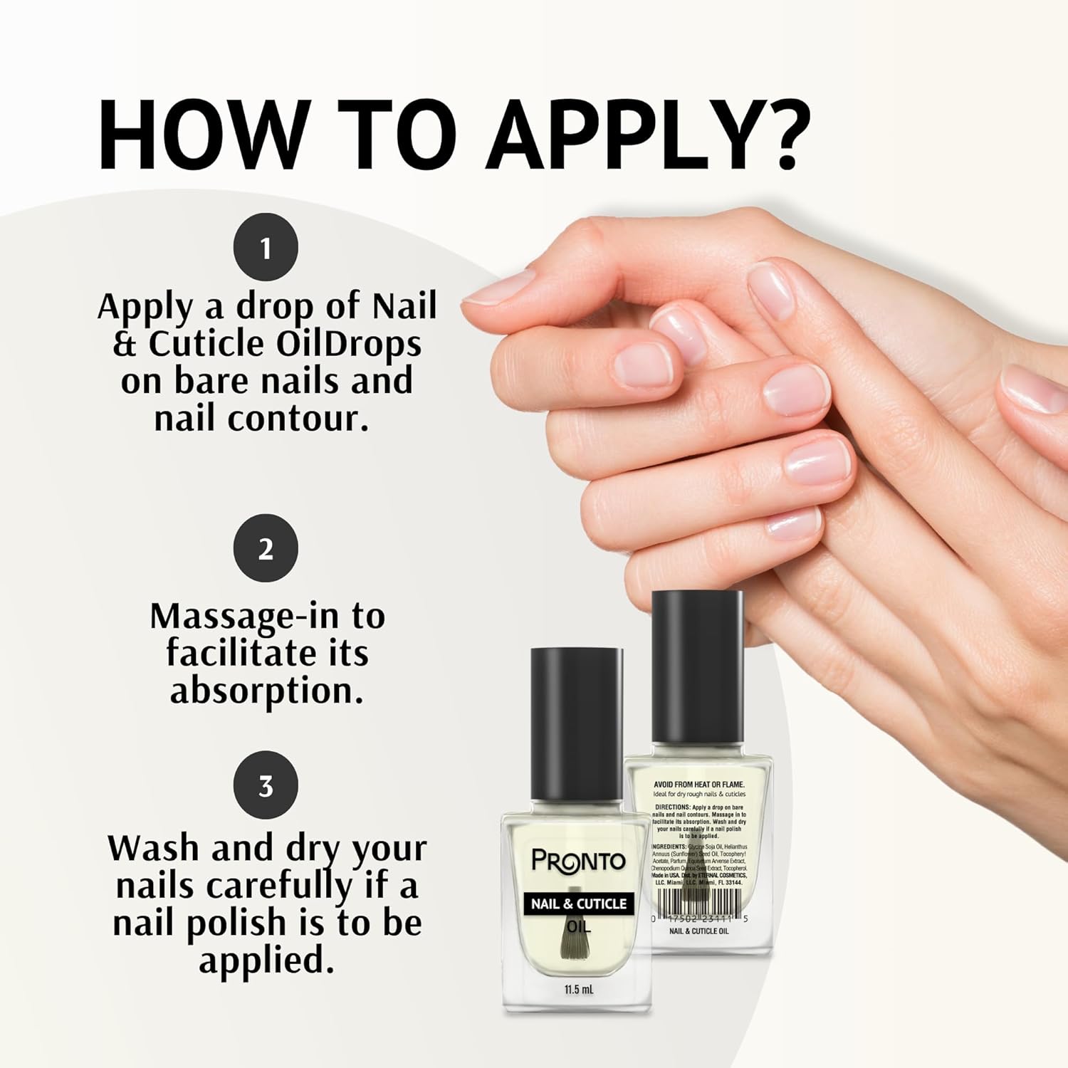 - PREMIUM QUALITY PRODUCT: Our Pronto fingernail polish remover & cuticle drop duo are proudly made in USA, using 100% pure acetone to effectively and efficiently remove all types of manicure and pedicure and cuticle oil to help deeply nourish and protect nails.