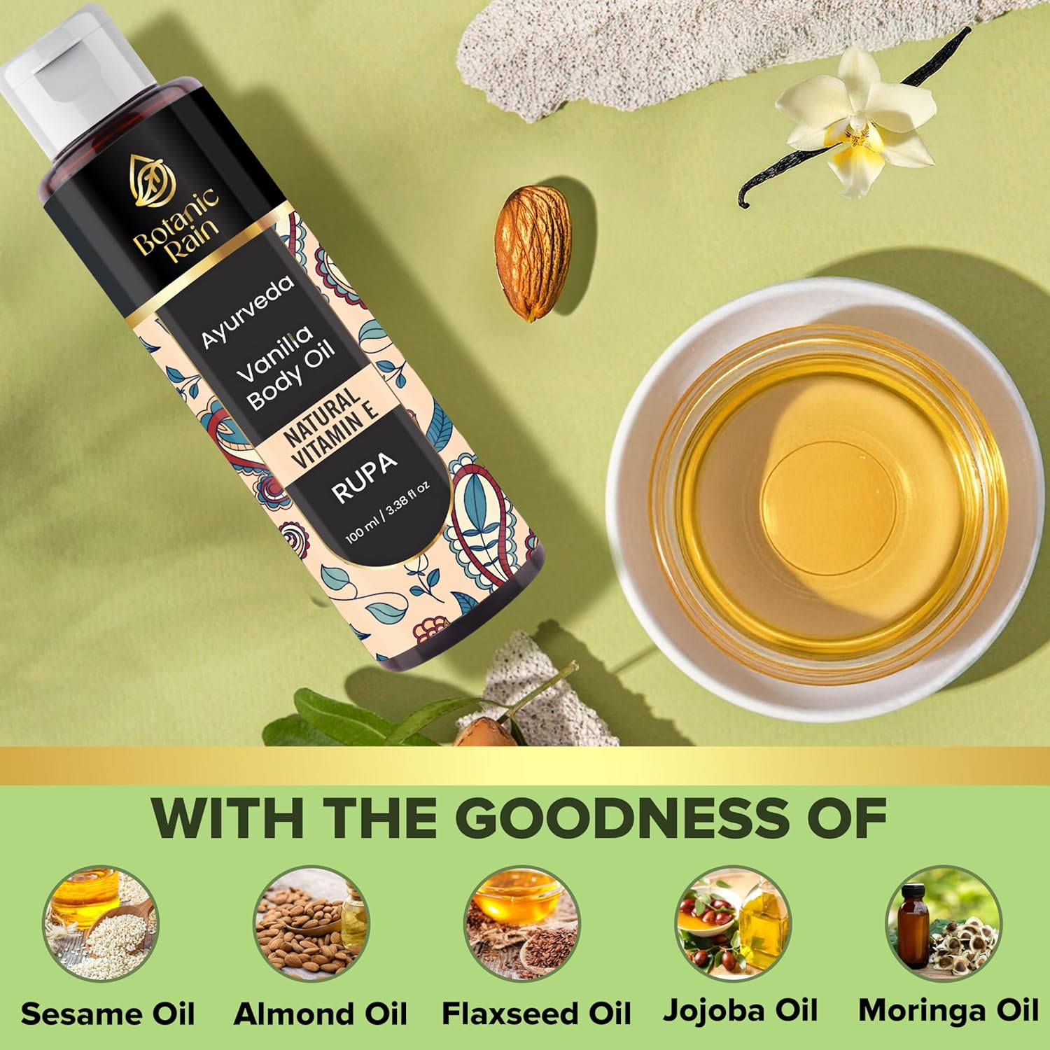 Ayurveda Vanilla Body Oil, Organic, Nourishing, & Hydrating Moisturiser for Dry, Flaky Crepey Skin - Fast Absorbing, Non-Greasy, Ayurvedic for Women & Men – 3.38 fl oz (1)