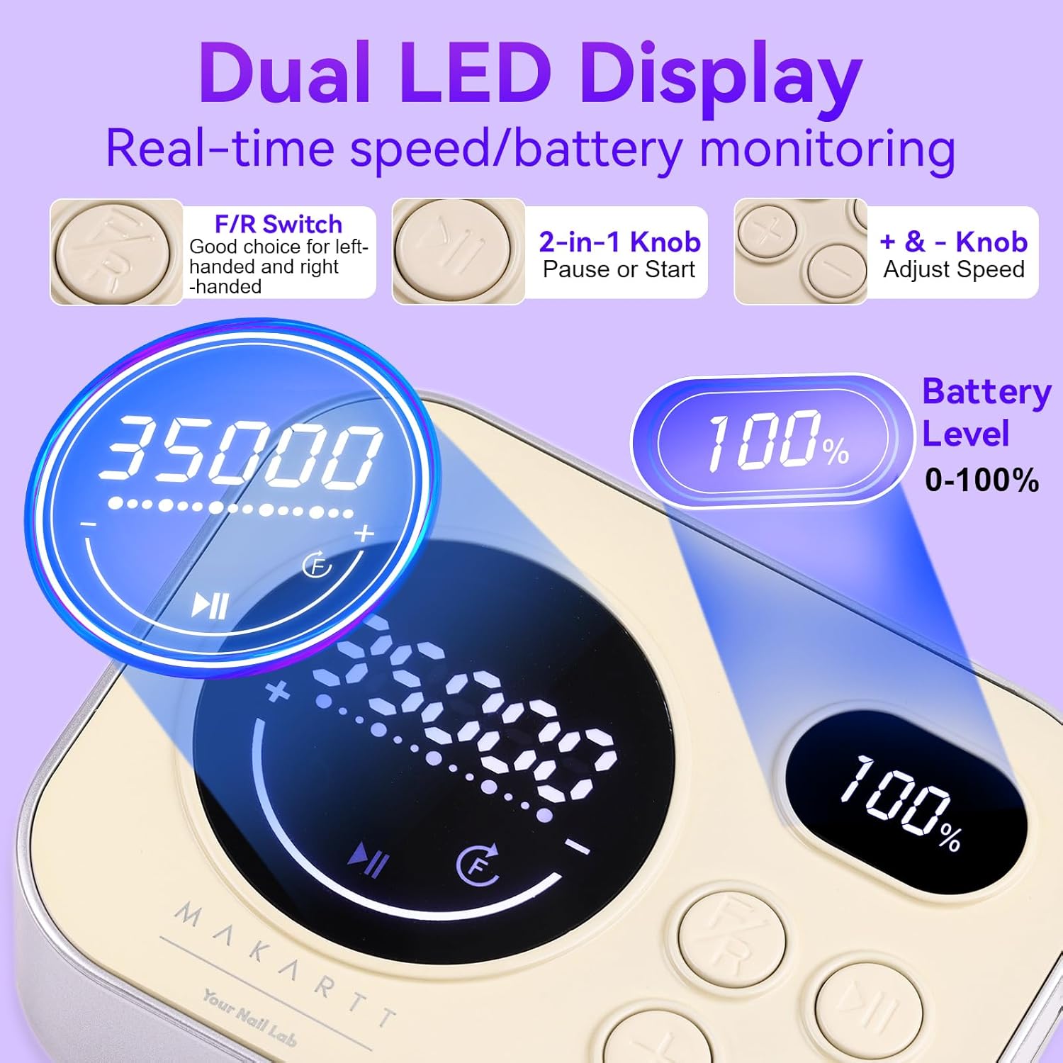Makartt Electric Nail Drill: Rechargeable Nail Drill Machine 35000RPM, Adelise Ultra Smooth Portable E File Nail Grinder with Nail Bit