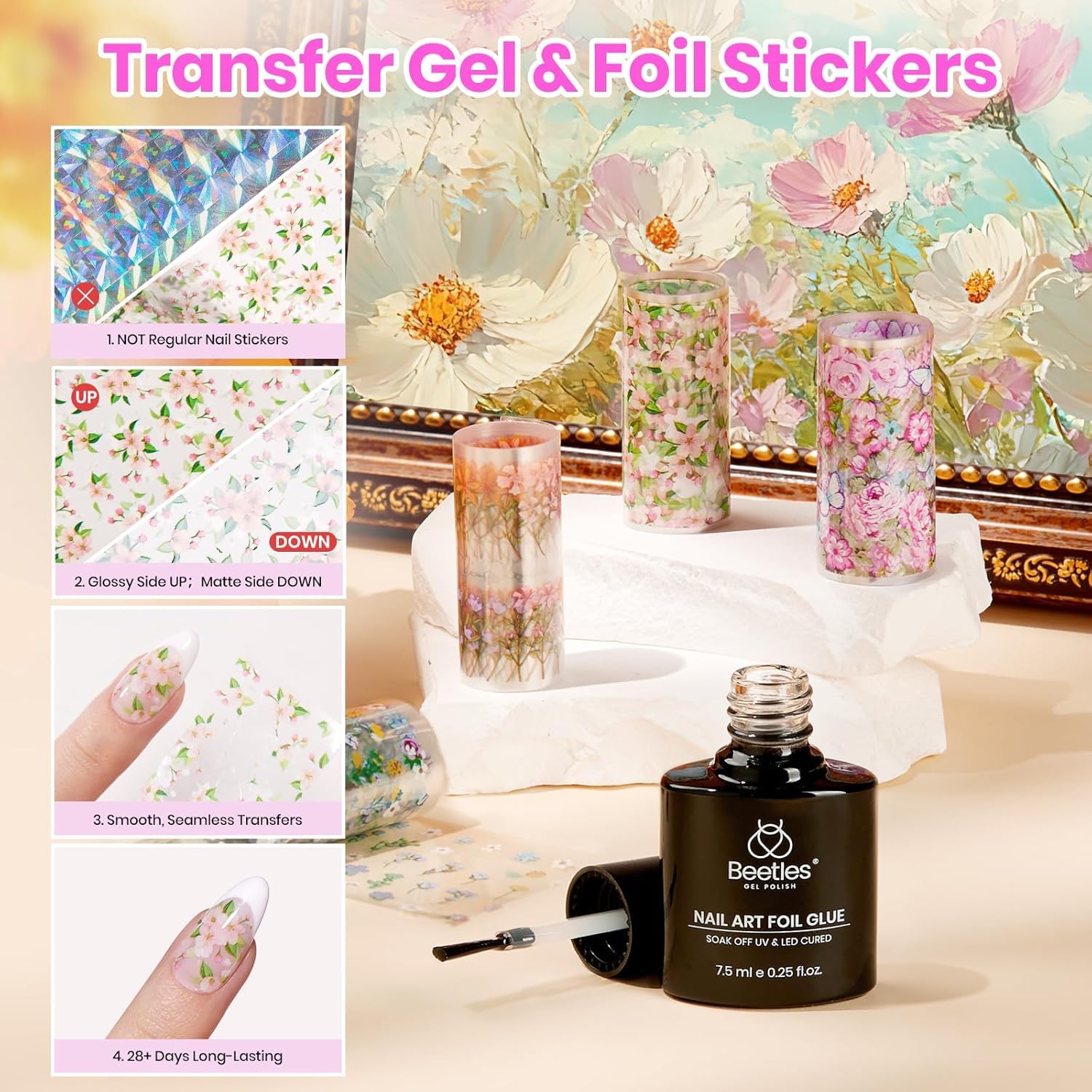 - 36 Colors Gel Nail Kit: Beetles gel nail polish including 36 classic and fashionable colors gel, 1 x No Wipe Base and 1 x Glossy Top Coat, 1 x Nail Art Foil Glue , 3 x Flower Nail Art Transfer Sticker. This Summer gel polish Impressionist Garden set is an essential for everyone!
