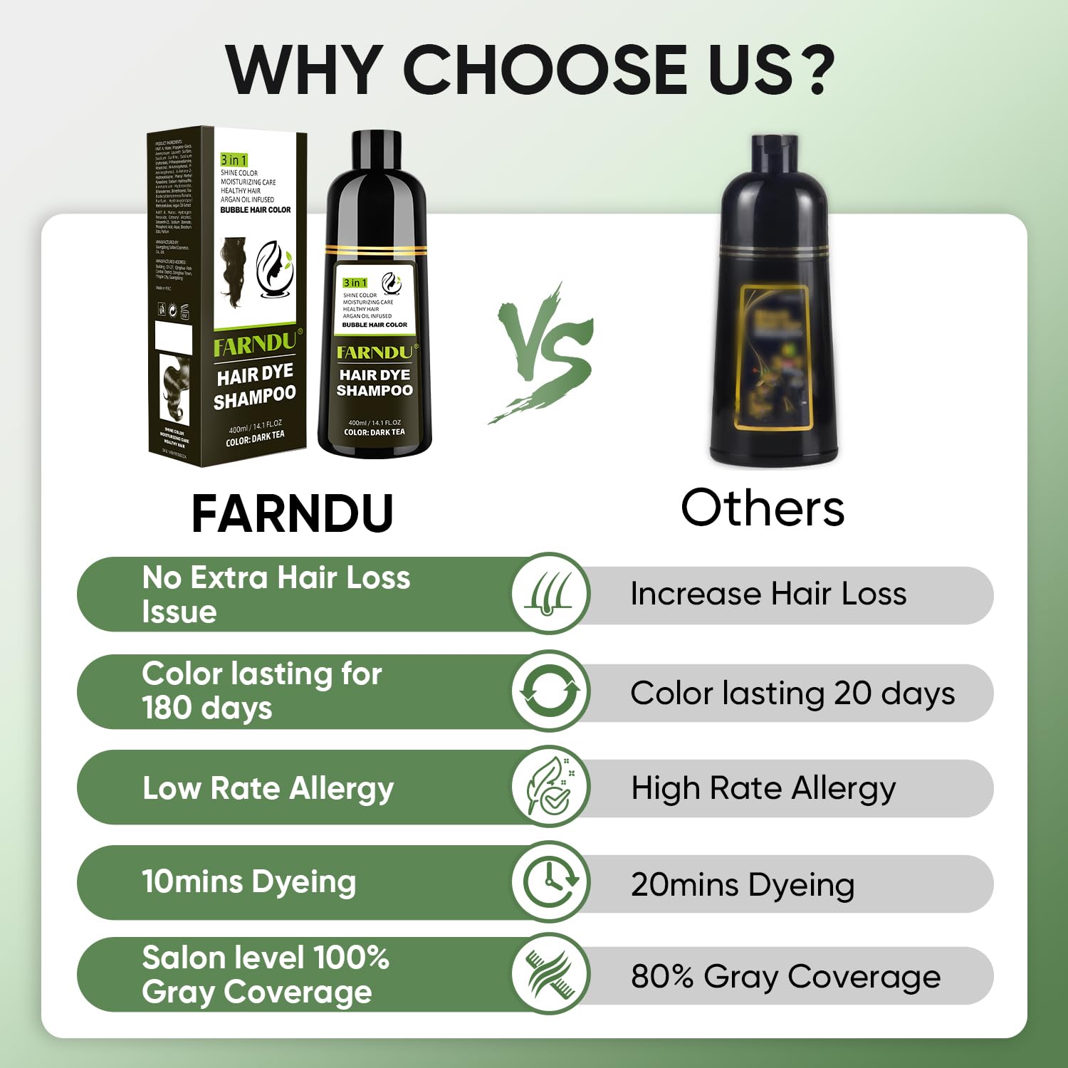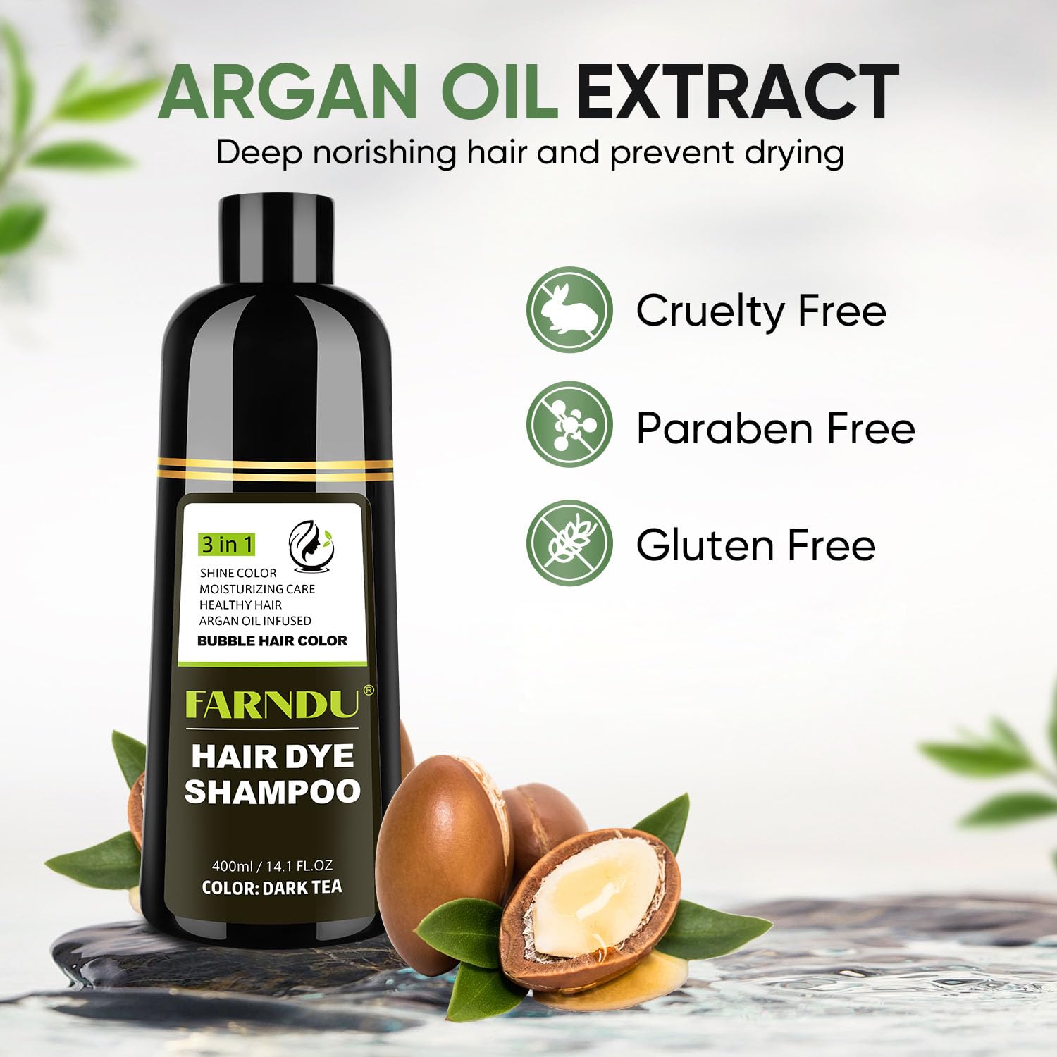 - GRAY HAIR COVERAGE SHAMPOO – Obtain back the fresh-looking hair of your younger days, get back the lost luster, and replenish the health of your weak strands with FARNDU black hair color shampoo for gray hair. Formulated to help you achieve vibrantly colored locks, this hair color shampoo dye will treat your hair with a special combination of active botanicals.