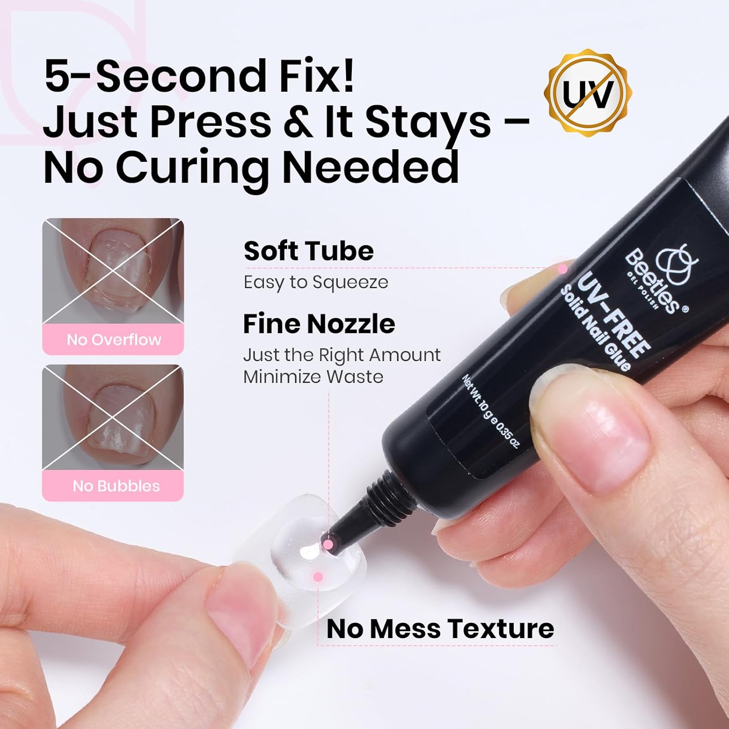 - Uv-Free Solid Nail Glue: This semi-solid glue No Uv Light Needed 5 second quick set ensures that press on nails, while not easy to flow, easier to control the amount, even if you are a DIY nail art beginners can also be easily managed!