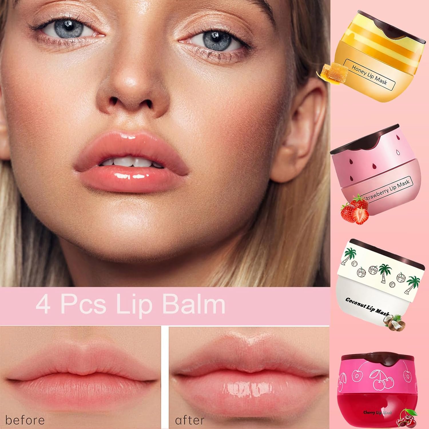 4 PCS Bee Lip Balm Honey Pot, Honey Strawberry Cherry Coconut Sleeping Lip Mask Overnight with Sticks, Exfoliating Prevention Dry and Crack Lip Scrubs