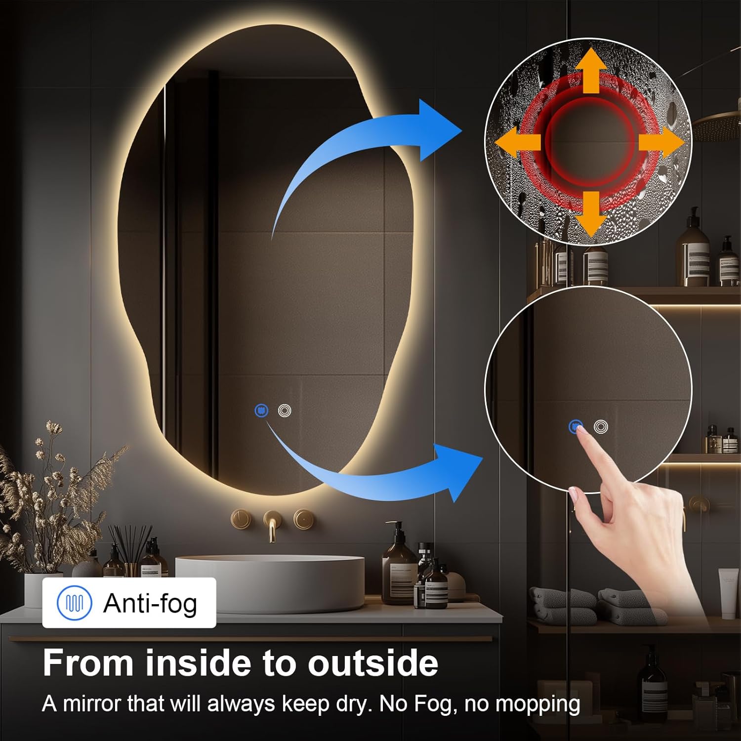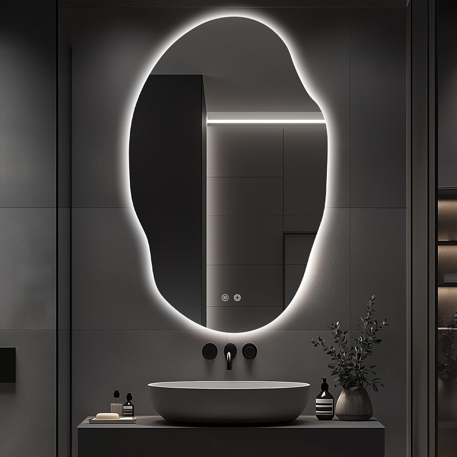 Asymmetrical LED Bathroom Mirror with Lights,Irregular Led Bathroom Vanity Mirror for Wall with Front and Backlit, Anti Fog, 3 Colors and Dimmable Light,[Horizontal/Vertical] 48" H x 30" W