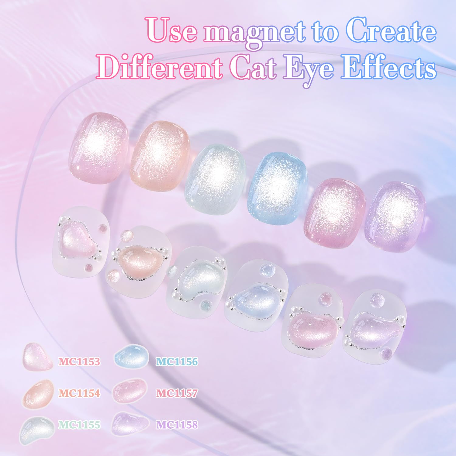 Double Rhythm Cat Eye Gel Nail Polish Set of 6 Same Color Same Bottle 0.5 Oz Shimmer Glitter with Magnet Holographic Reflective Magnetic UV Nail Polish Kit (Silver Nude Pink Blue Purple-T6-28)