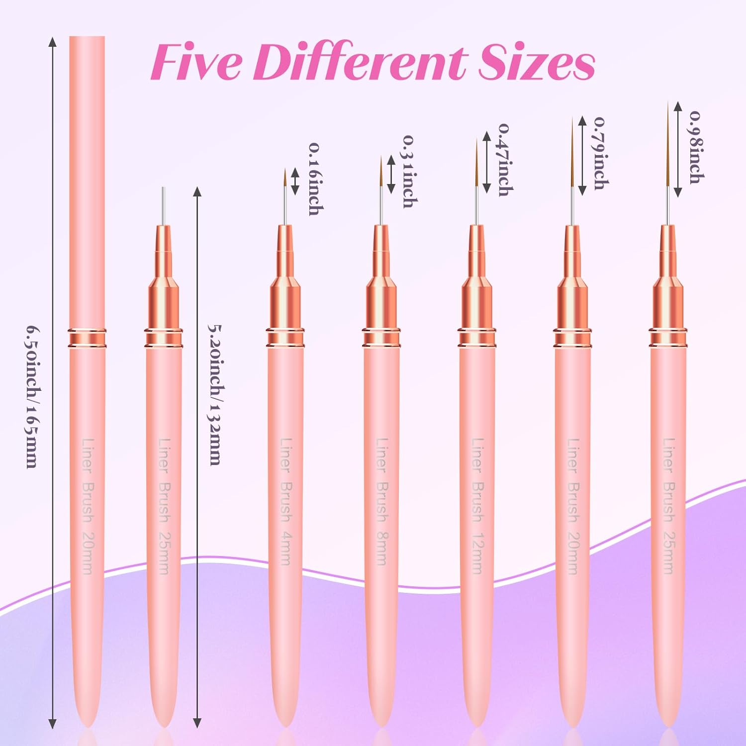 - Value Pack - This set includes 5 small nail art brushes of different lengths(4/8/12/20/25mm), to meet various nail art needs. From intricate designs to simple patterns, you'll unleash your creativity and achieve stunning nail art results with the nails design brush