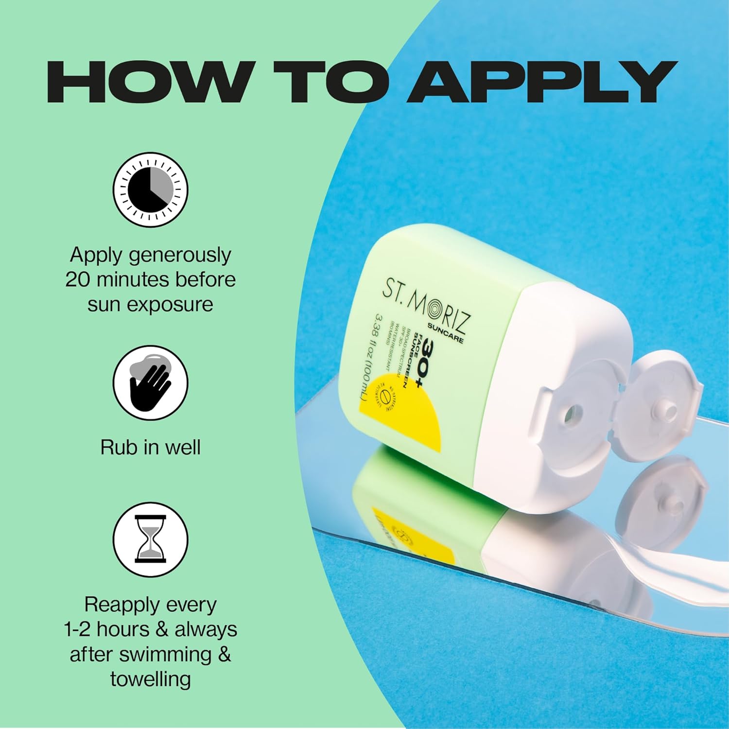 - HOW TO USE: Apply liberally 15 minutes before sun exposure. Reapply: After 80 minutes of swimming or sweating. Immediately after towel drying. At least every 2 hours.Being safe in the sun shouldn't be boring! Our daily use, broad spectrum protection formulas combine sunscreen & skincare to future-proof your skin! Use St. Moriz Suncare alongside St. Moriz Self Tan for a sun safe glow.