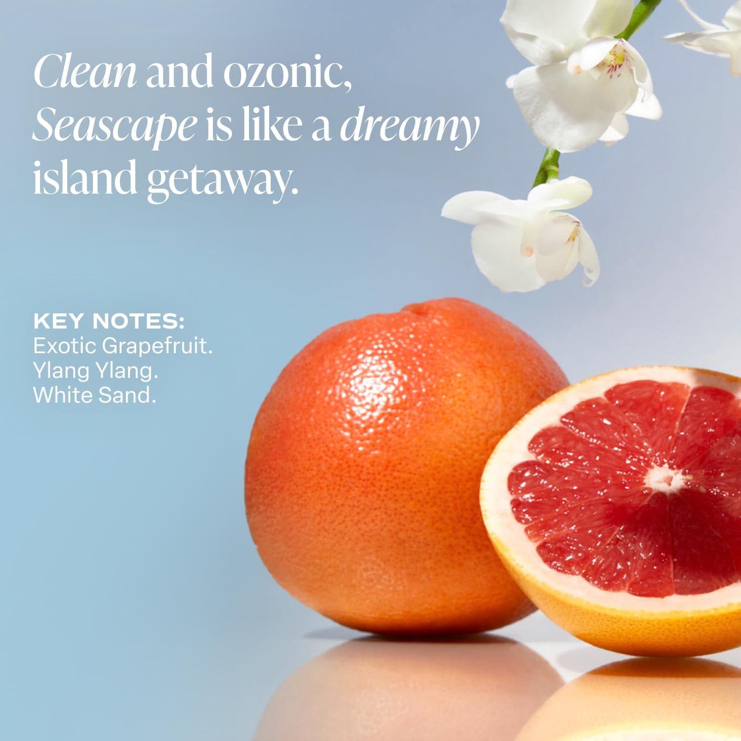 - SEASCAPE FRAGRANCE: Exotic Grapefruit, Ylang Ylang, and White Sand create a bright, tropical, and slightly sensual fragrance. Zesty and floral, like a crisp morning air by the ocean with a lingering scent of citrus and flowers. Clean and ozonic, Seascape is like a dreamy island getaway