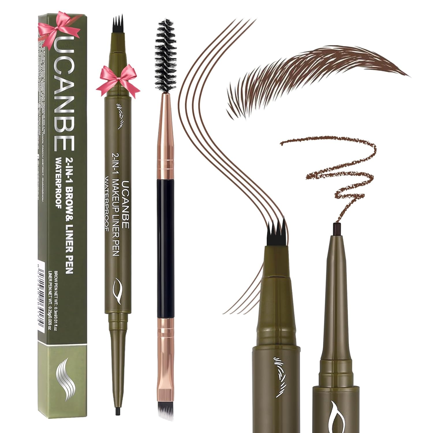 UCANBE Eyebrow Pencils for Women with Spoolie Brush, Dual-Ended Eyebrow Pen with 4-Fork-Tip & Gel Eyeliner, Microblading Brow Pen with Eyeliner Pencil + Brow Brush for Hair Like Brows, Dark Brown