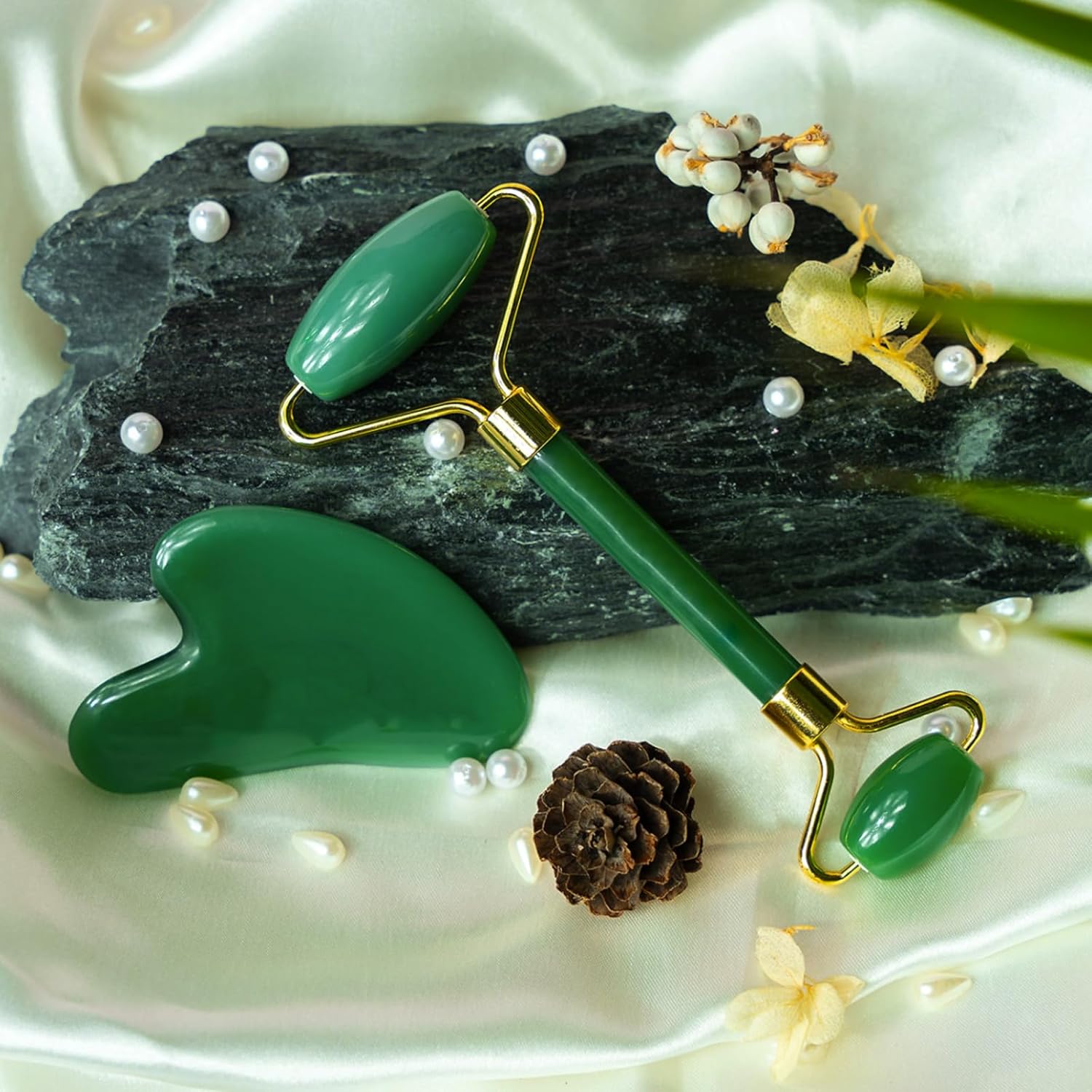 - Gua Sha Facial Tools with Natural Jade – Crafted from genuine jade stone, smooth and durable, designed to boost circulation, promote lymphatic drainage, and give skin a healthy glow.