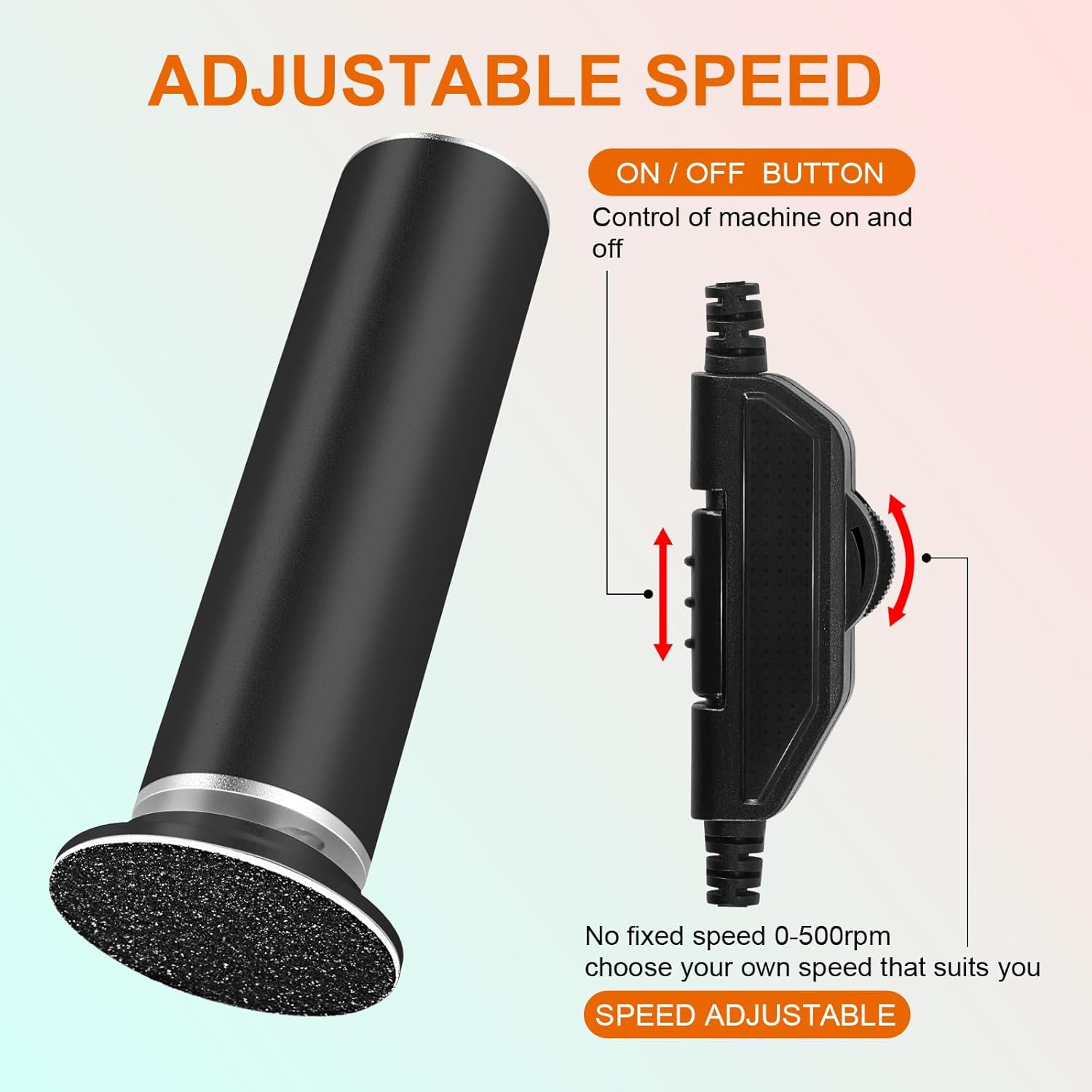 - ADJUSTABLE SPEED: Are you still using traditional electric feet callus remover with only 3 or 2 speeds? Our electric foot file sander has unlimited speeds, and you can adjust the speed within the speed range (0-500rpm) to suit yourself, removing dead skin from the heel more gently and smoothly.