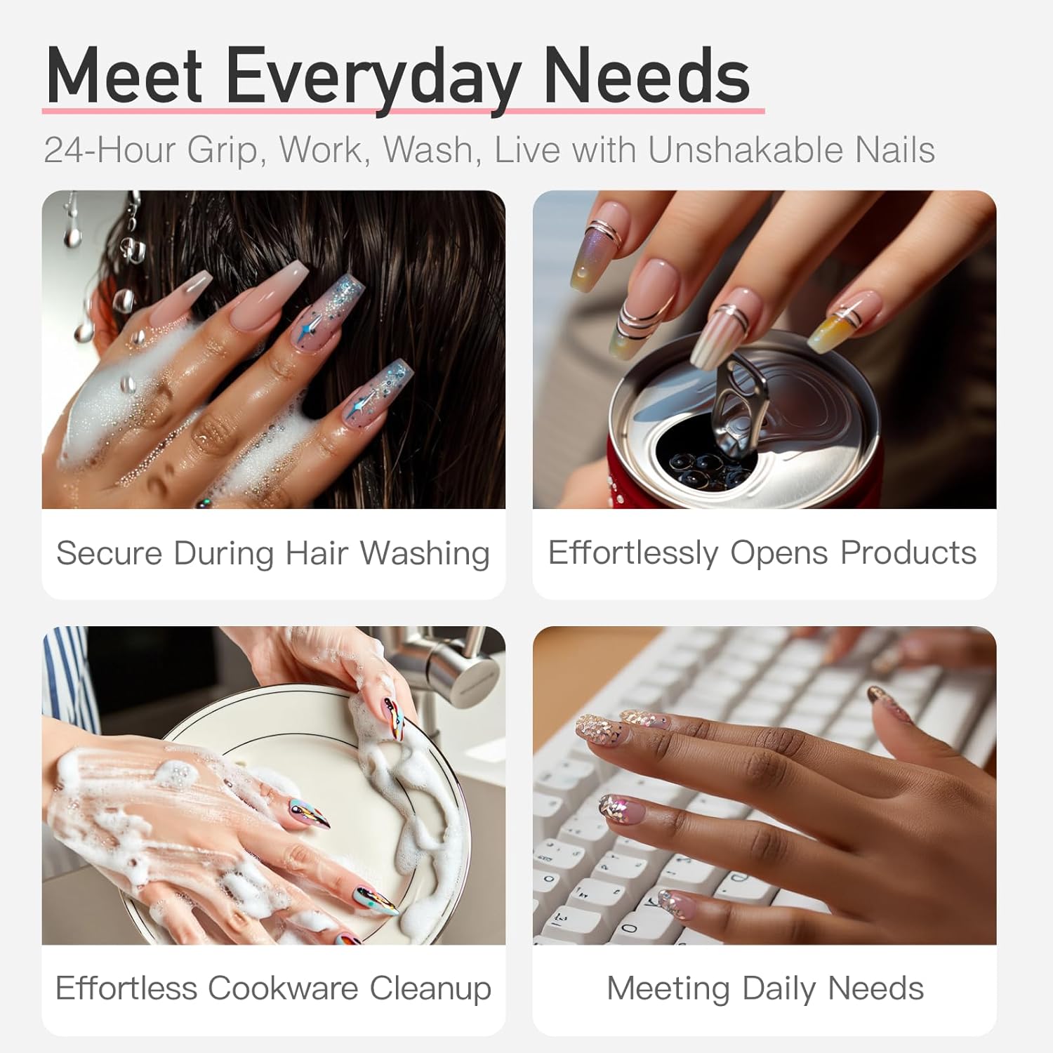 - Strong Bonding for Daily Life:Formulated for durability, this semi-solid nail glue creates a powerful bond that fully sets within one hour. Once affixed, it withstands water exposure and daily activities—whether you're washing dishes, working out, or simply living your busy life, your nails stay flawless