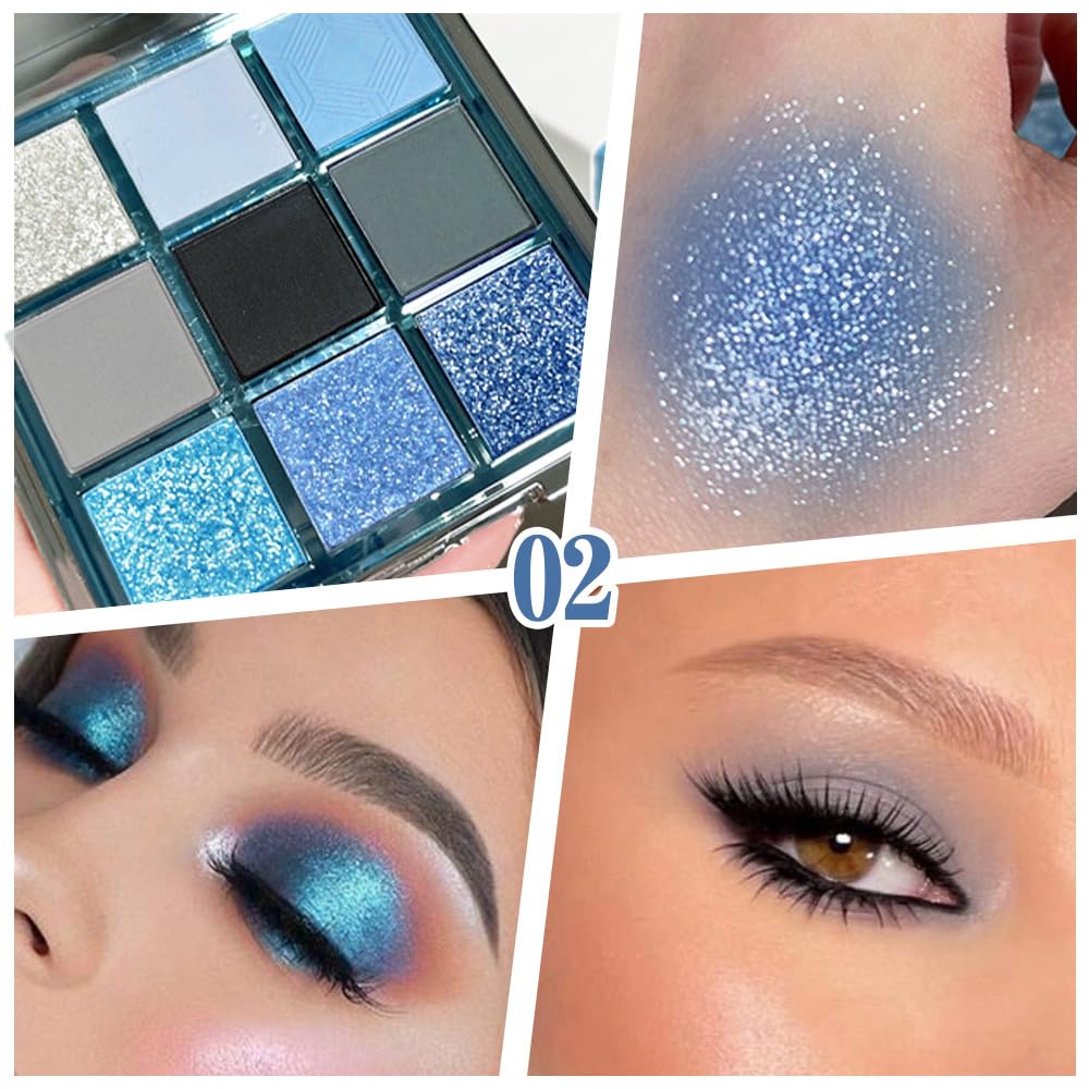 - 1. 🎨 9 Cool-Tone Eyeshadow Colors for Every Look This eyeshadow palette features 9 trendy and wearable shades: White glitter, Light blue matte, Sky blue matte, Silver-gray matte, Black matte, Gray-blue matte, Bright blue glitter, Light blue glitter, and Blue-gray glitter. From soft daytime glam to bold party looks, this is your go-to eye makeup palette.