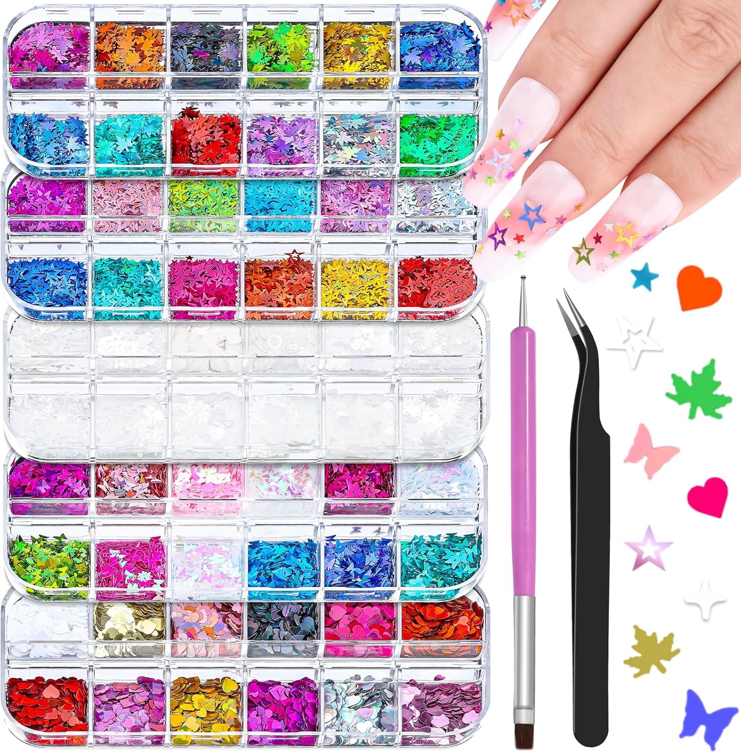 - Nail Sequins Decoration Kit: You'll get 5 boxes of mixed-shaped sequins (butterflies, hearts, stars, moons, flowers, diamonds, etc.), 1 pair of precision tweezers, and 1 cs of dual-end nail brush/dotting pen—everything you need for stunning nail art!