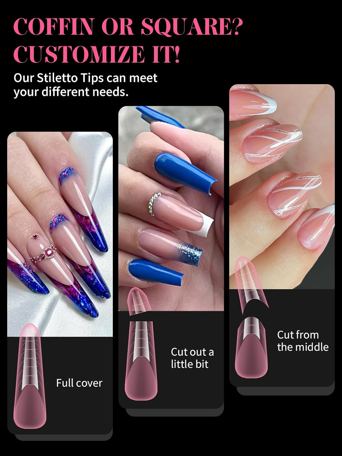 - 【Nail Form Mold with 12 Sizes】120pcs stiletto clear dual forms for poly nail gel offers 12 different nail sizes , and each size of long nail tips is separated by a small grid, a total of 12 grids, so they're easy and convenient to choose the suitable size to meet your nail's need.