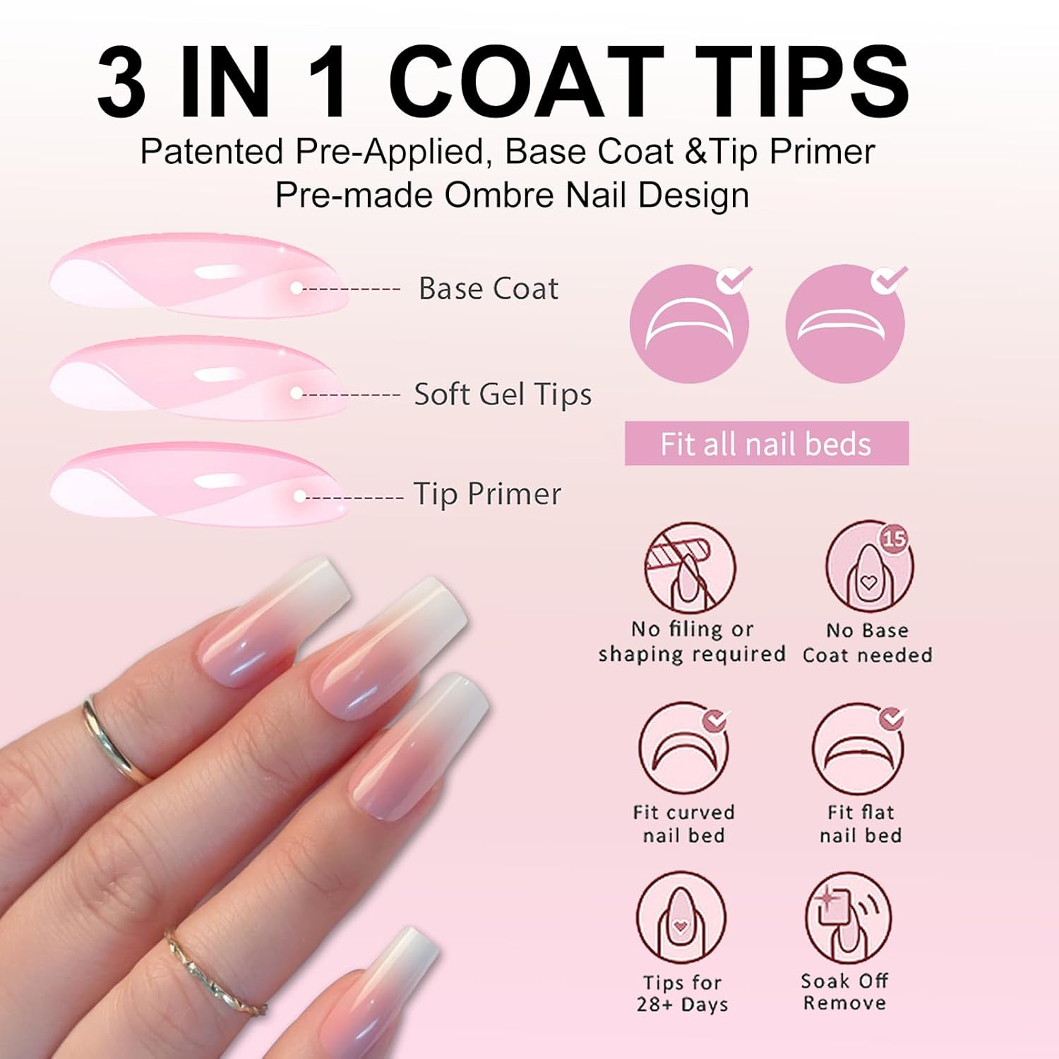 Ombre Press On Nails - 240Pcs Short Square False Nails Kit, Pink White Gradient Nail Tips Soft Gel False Nail with Glue Salon Fake Nails Kit Extensions DIY (Medium Long Square)