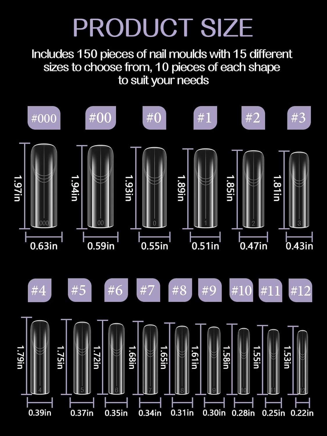 - Included Components : 15 Different Sizes, 150 Dual Form Nail Molds