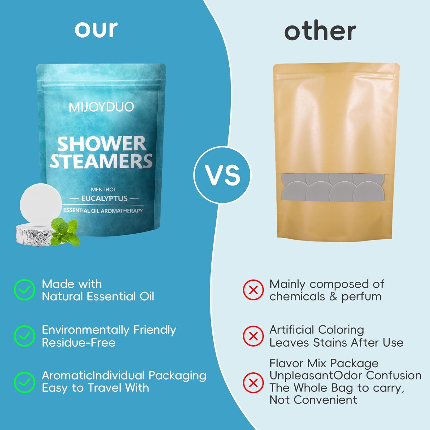 - 3. 【Relieve stress】eucalyptus shower steamer's delicate mint and eucalyptus aroma will relax your body and mind. Whether it is a day of fatigue, work pressure or trivial matters in life, Spa Shower Tablets's natural fragrance will take you away from worries and enjoy a moment of tranquility and comfort.