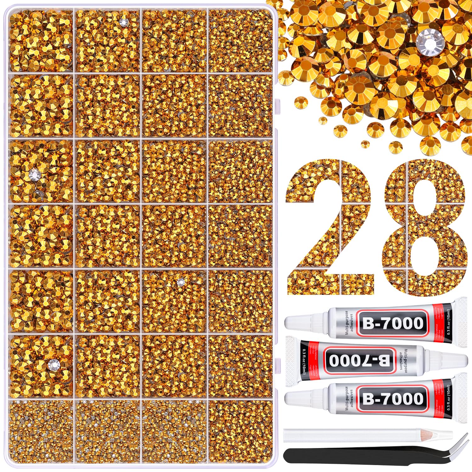 - PACKAGE CONTENT -- Include 1 box with 28 grids, featuring a variety of sizes, approx. 30000 pcs bling-out resin rhinestones (Mine Gold). 1 tweezers and 1 pickup pen are included for easily picking up of rhinestones. 3 B7000 glue for jewelry making