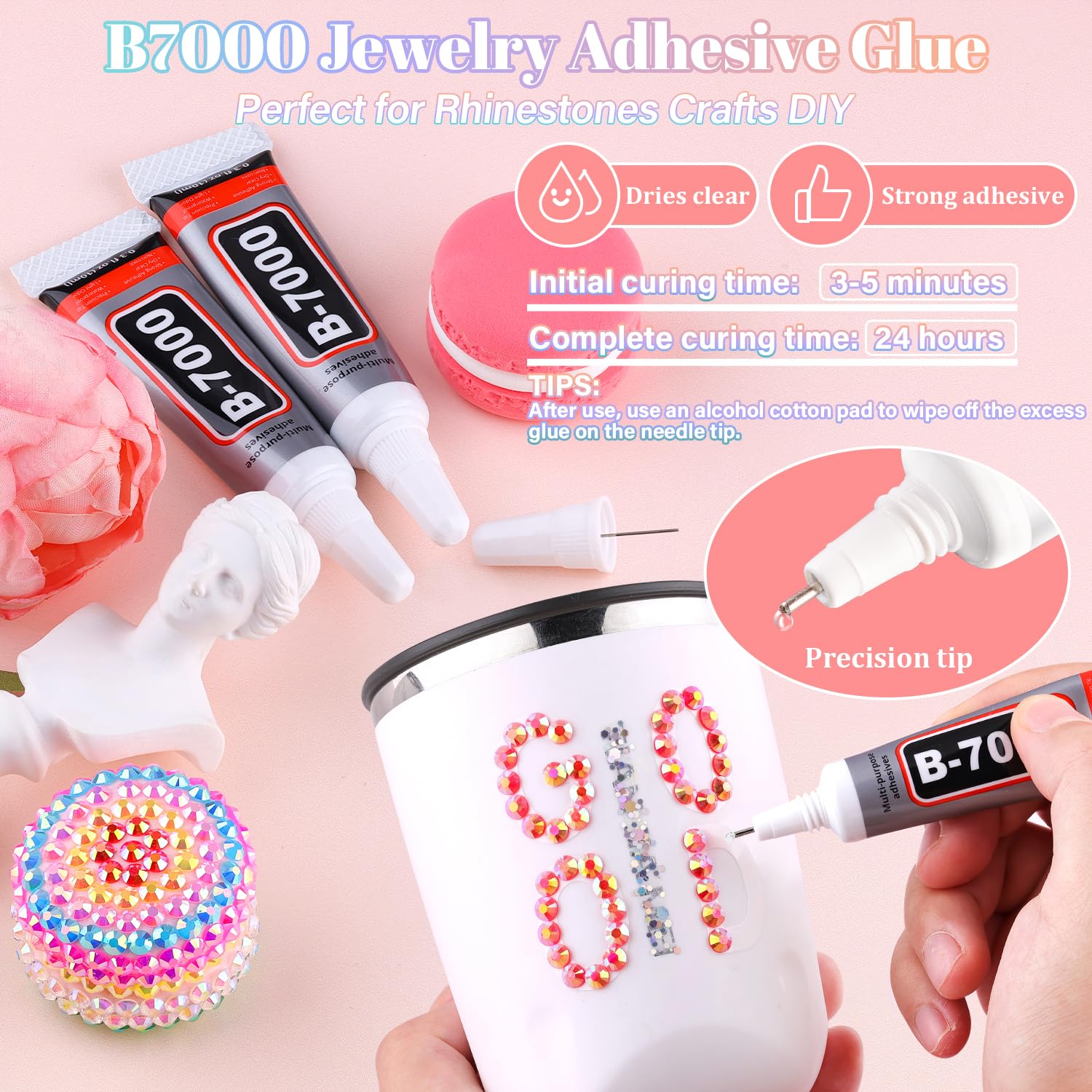 - B7000 CLEAR GLUE FOR GEMS -- Strong adhesion and dries clear, precision needle for easy application. The initial cure time is 3-5 minutes and the full cure time is 24 hours. After use, the needle should to be wiped with an alcohol pad