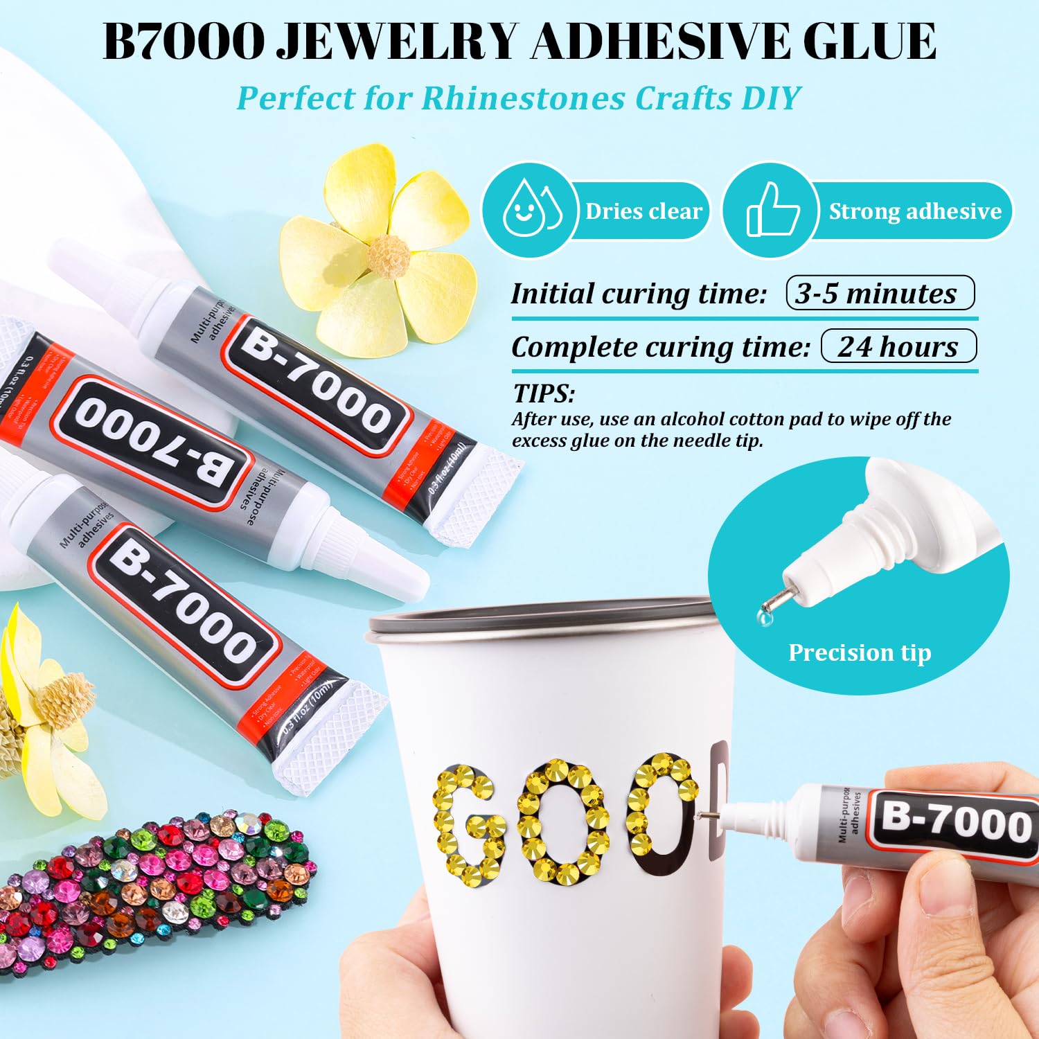 - STRONG B7000 GLUE FOR GEMS -- These Non-Hotfix rhinestones are not self-adhesive and need to be used by glue. The equipped B7000 glue has strong adhesion and dries clear. It has a precision needle for easy application. For first use, you can leave the glue head up for a few minutes before opening to avoid overflow. After use, the needle needs to be cleaned with an alcohol wipe so as to avoid a mess.
