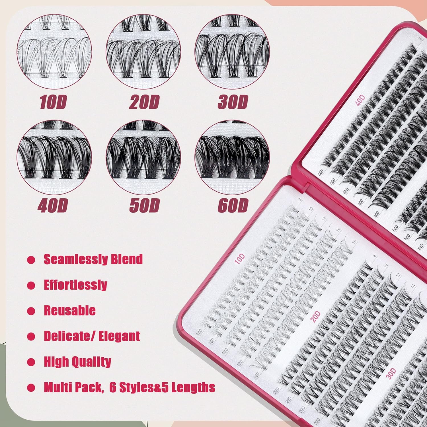 - Build Your Signature Look 10D-60D Customizable Volume System: Mix 6 iconic densities 10D for inner corner subtlety,20D eyelash clusters for barely there wisps, 30D for office chic, 40D for date-night drama, 50D for stage-ready volume,60D for dramatic outer wings to create 7+ salon-level styles.20D= Density | Each cluster contains 20 ultra-fine strands (0.07mm tapered tips) featherweight fan shapes - equivalent to 2-3 natural lashes per cluster.