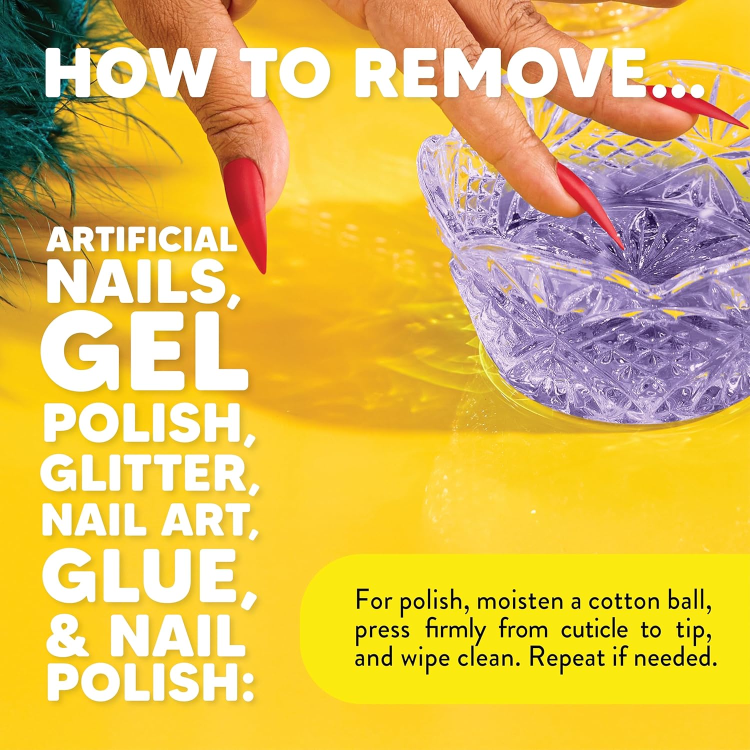 - Directions: Simply clip the artificial nails, and soak your fingers in a bowl of the nail remover for 15 minutes. Gently file down the softened product and soak for another 15. For regular polish, Moisten cotton balls and massage the nail bed