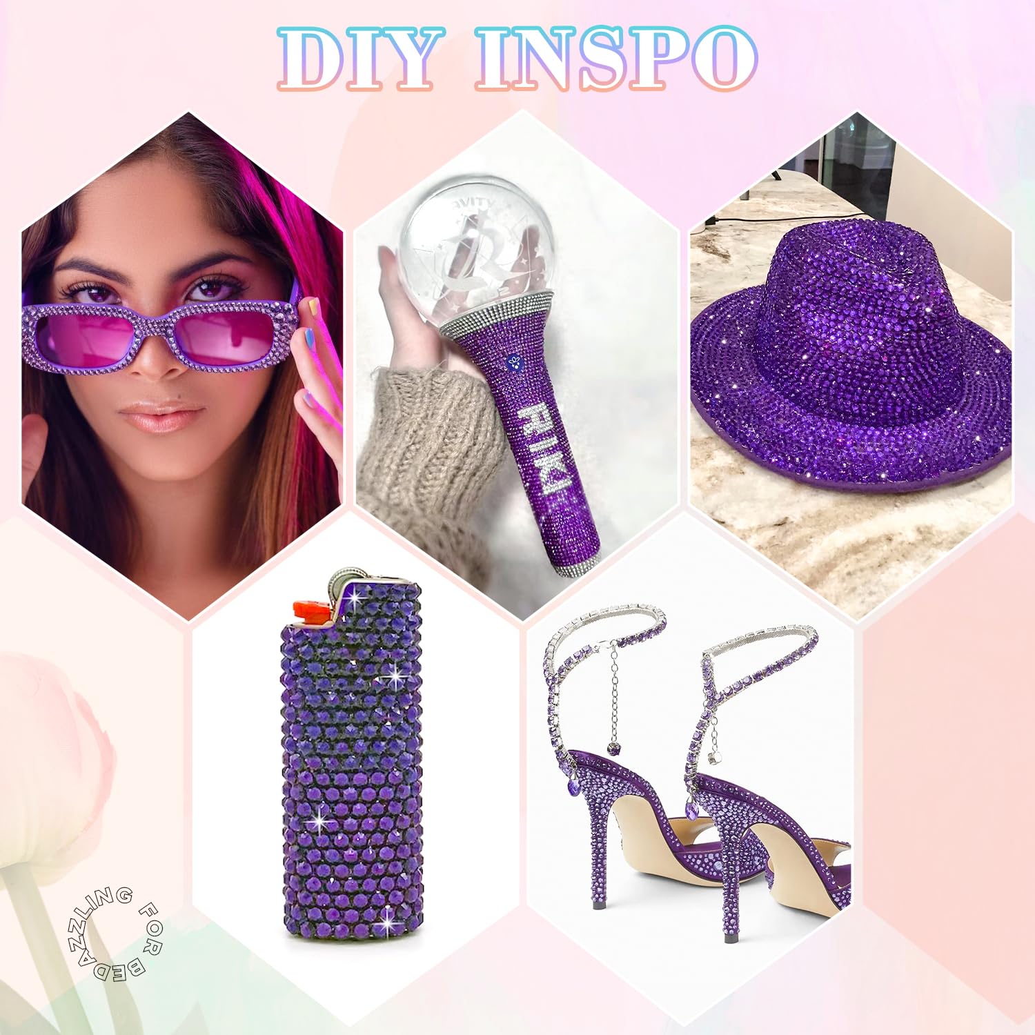 - PACKAGE CONTENT – This all-in-one bedazzler kit includes everything you need to start creating dazzling designs: 1 box of purple rhinestones with 24 grids (approx. 30,000 pcs of bedazzling rhinestones assorted size SS6/10/16/20/30 ), 1 precision tweezers, 1 pickup pen for handling small gems, and 3 tubes of B7000 jewelry glue for secure application.