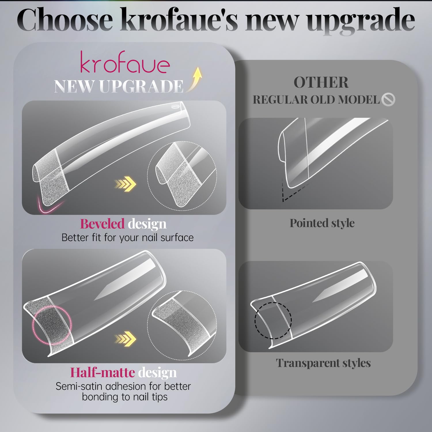 - THICKER FRONT & THINNER BACK:krofaue nail tips engineered with thicker front ends for durability and thinner backs for natural fit. The press on nails french slight curve adapts to most nail shapes, providing ultimate comfort that lasts 2-3 weeks. Say goodbye to uncomfortable tightness!