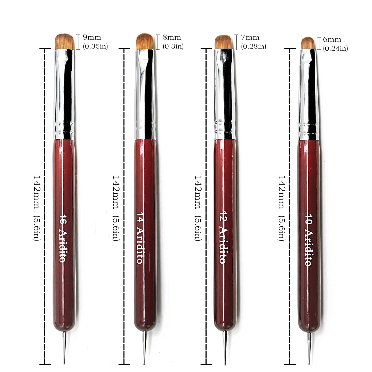 4Pcs Professional Acrylic French Manicure Clean-Up Brushes & Dotting Pens - Red Wood Handles, Precision Tips (#10#12#14#16) for Nail Art, Cuticle Care
