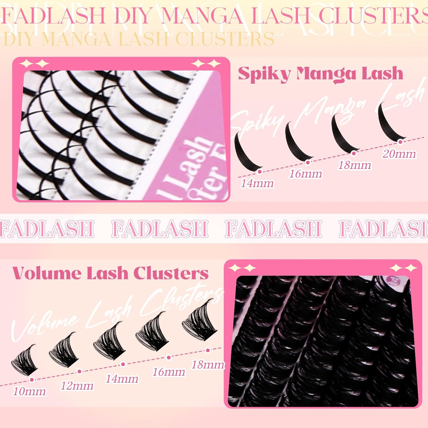 - Curling Eyelash Clusters with Spikes Eyelash: Our advanced series combination of curling clusters eyelash and manga spikes eyelash clusters. You can choose from 14-20mm Spiked lash clusters and 10-18mm D-curled soft eyelashes. Different lengths can be matched with different makeup looks to perfectly showcase a unique comic style eyelash effect.