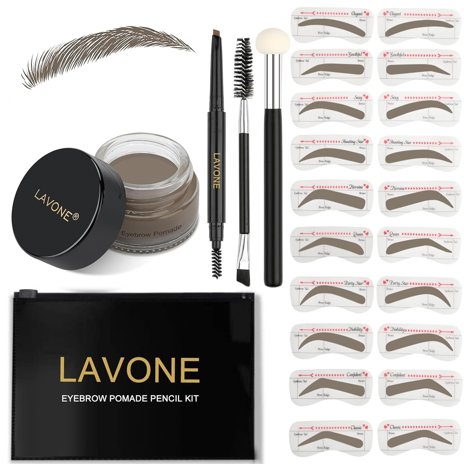 - [What’s in the eyebrow kit]: LAVONE makeup eyebrow kit includes eyebrow powder(dark grey), brow pencil (dark brown), 20 eyebrow stencils (10 different shapes), a sponge applicator, a dual precision brush and a zipper pouch for on the go.