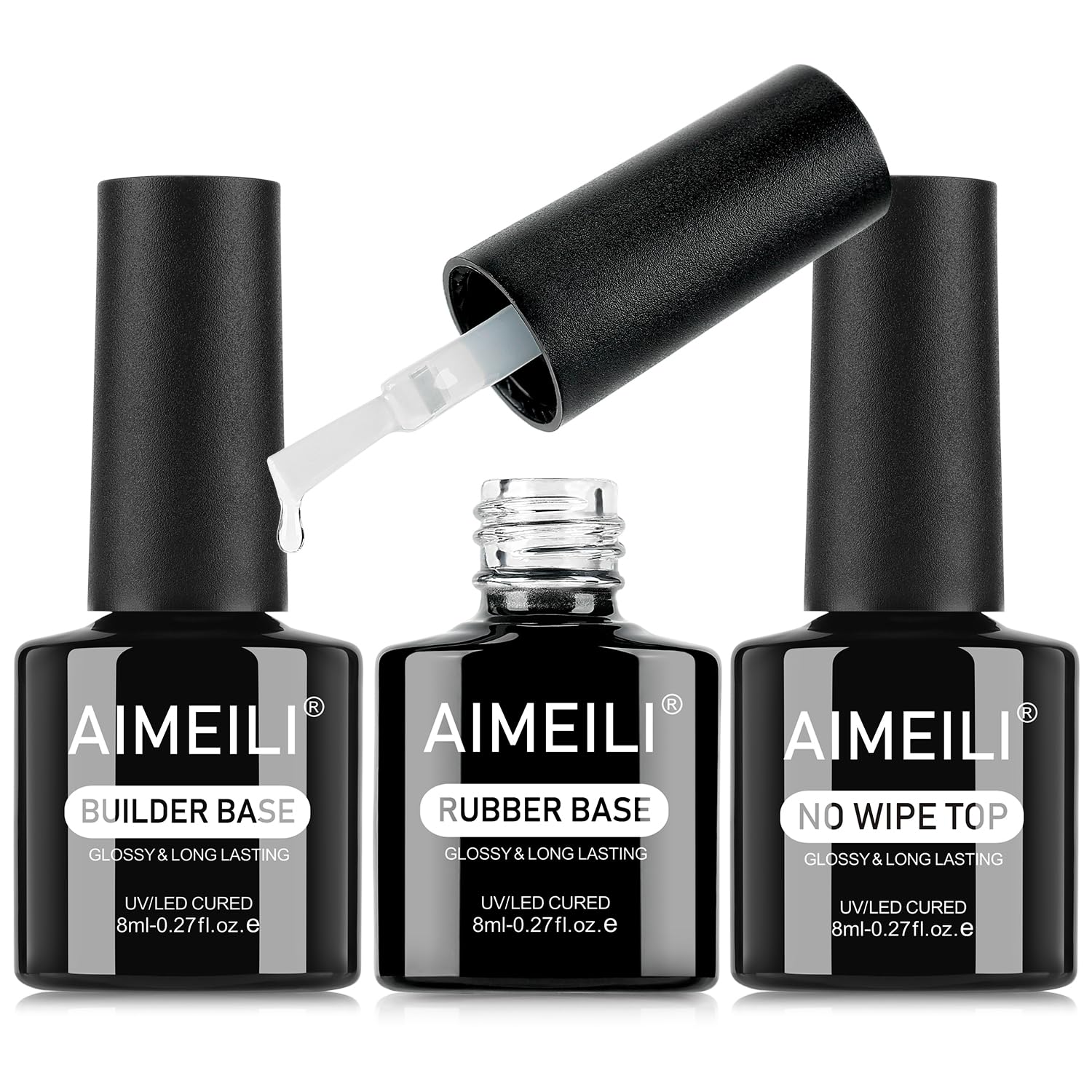AIMEILI Builder Nail Gel Rubber Base Top Coat Kit 3pcs, Hema Free, Cruelty Free, Vegan, Clear High Gloss Gel Nail Polish Long Lasting Nail Art