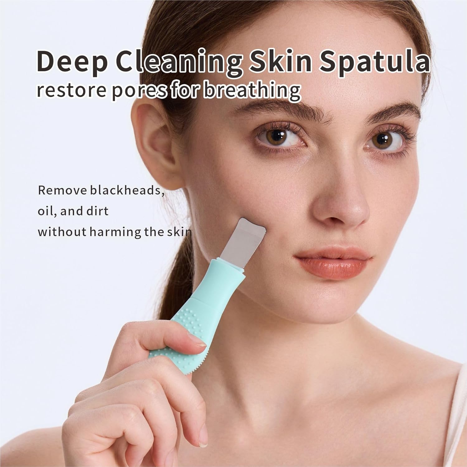 - Face Scrubber Skin Spatula: The 2in1 skin care tool made of harmless silicone material.Non-slip silicone handle helps you control the force more precisely. silicone bristles with 2 different ends 304 stainless steel spatula effectively removes pore dirt, grease and cuticle even from hard-to-reach areas around the nose and ears.
