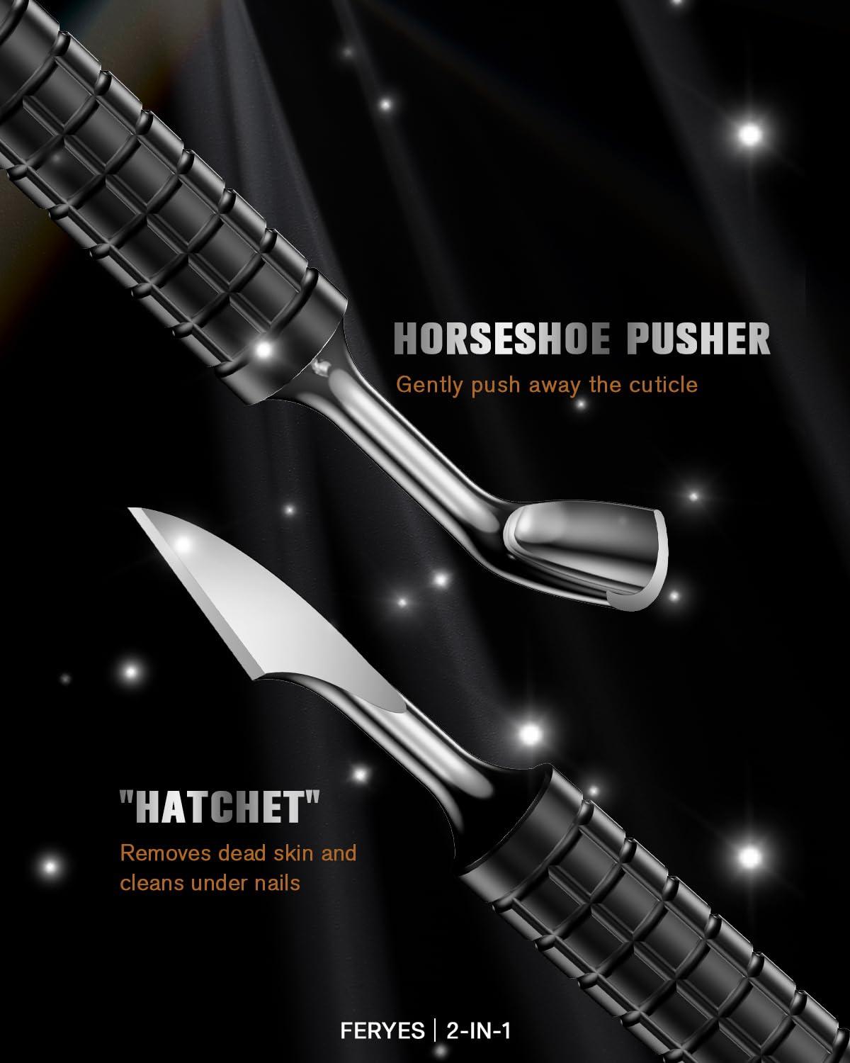 FERYES Upgraded Dual-Head Cuticle Pusher Tool - Horseshoe Shape & Chisel Edge Stainless Steel Remover Tool with Anti-Slip Wide Handle for Salon & Home Nail Care-Black